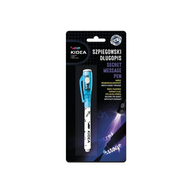 Magiczny długopis z lampką LED posiada tusz widoczny tylko w świetle wbudowanej latarki UV. Podczas pisania tusz jest niewidoczny, a aby przeczytać wiadomość należy podświetlić kartkę. To świetna zabawa w ukrywanie informacji i sposób, by dziecko mogło strzec swoich sekretów. Zasilanie na baterie.