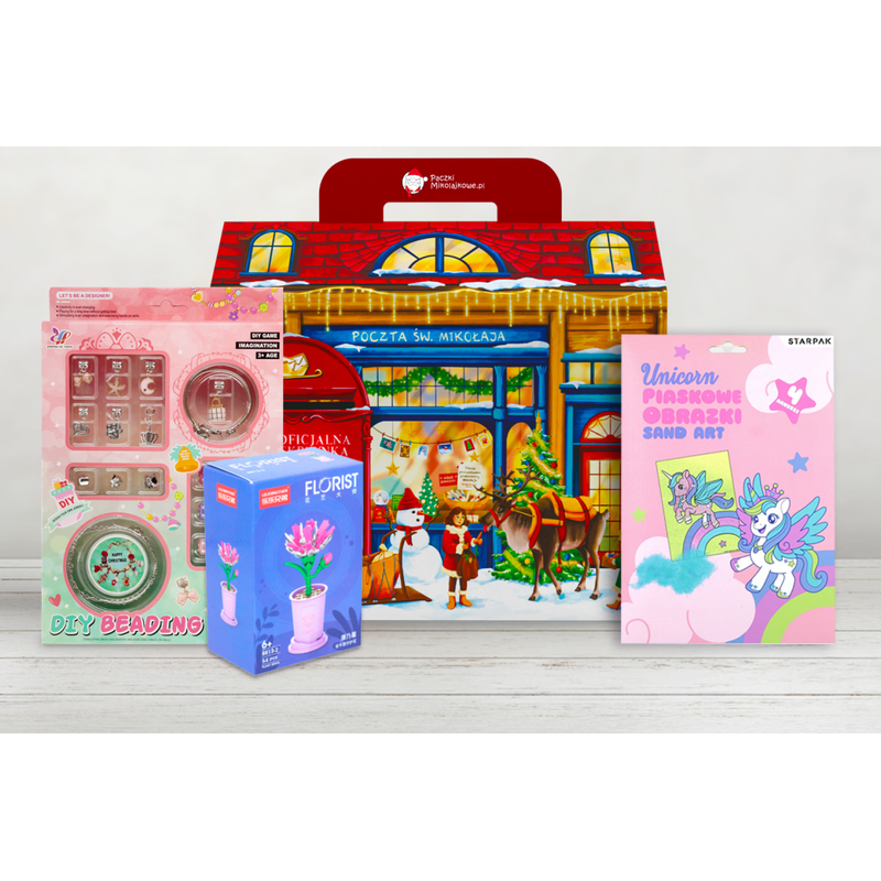 Paczka zawiera zestaw koralików do tworzenia biżuterii, który nie tylko zapewni świetną zabawę, ale również pomoże rozwinąć poczucie estetyki oraz uczy cierpliwości i koncentracji. Razem z nim paczka zawiera kolorowankę z piaskowymi obrazkami, zachęcającą do twórczej zabawy i rozwijania wyobraźni. Zestaw dopełniają klocki konstrukcyjne, które wspierają kreatywność, ćwiczą zdolności manualne oraz uczą wytrwałości.
