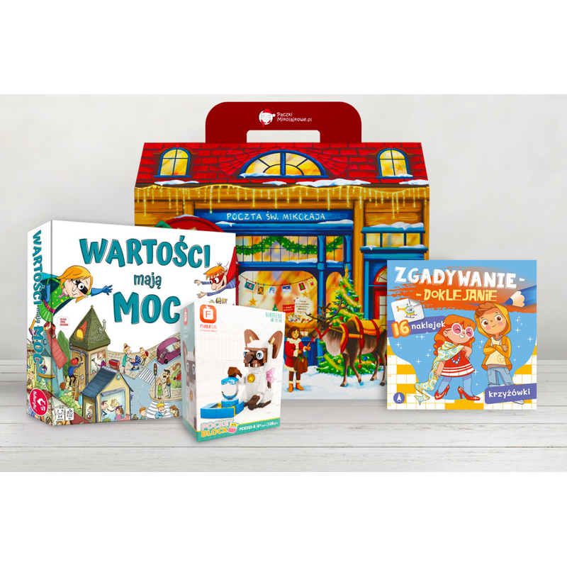 Paczka zawiera edukacyjną grę planszową, która w przystępny sposób uczy dziecko ważnych wartości i rozwija empatię, zestaw klocków konstrukcyjnych, wspierających sprawność manualną i pobudzających wyobraźnię, a także ćwiczenia z naklejkami, pomagającą doskonalić logiczne myślenie i koncentrację.
