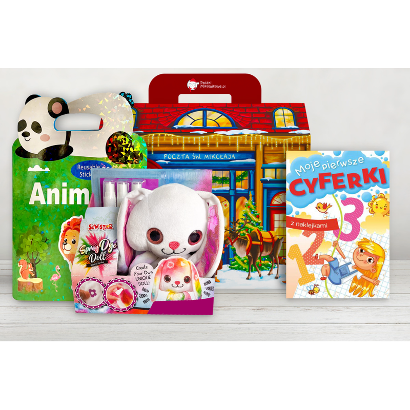 Paczka zawiera zestaw kreatywny do malowania, rozwijający zdolności manualne i kreatywność dziecka, pozwalający na twórcze eksperymentowanie z kolorami i dający satysfakcję z własnoręcznie wykonanego dzieła. Do tego dochodzi książeczka z naklejkami wielorazowymi, która zachęca do tworzenia własnych scenek i ćwiczy sprawność manualną. Całość uzupełniają świąteczne ćwiczenia z naklejkami, wspierające naukę liczenia oraz doskonalące pamięć i koncentrację.