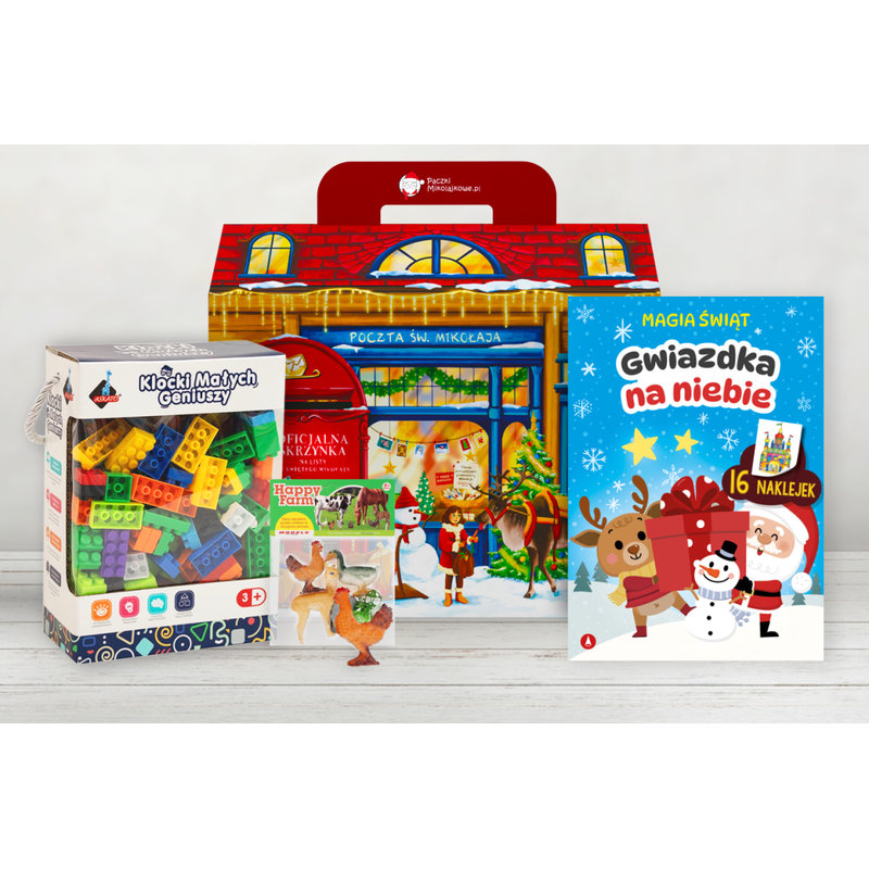 Paczka z zabawkami zawiera zestaw klocków konstrukcyjnych, który nie tylko dostarczy świetnej zabawy, ale także wspiera rozwój kreatywności i koordynacji ręka–oko. Oprócz tego w paczce znajdują się figurki zwierząt gospodarskich, zachęcające do rozwijania wyobraźni oraz tworzenia własnych historii. Całość uzupełniają świąteczne ćwiczenia z naklejkami, przynoszące radość z ukończonych zadań i wspierające dalszy rozwój dziecka.