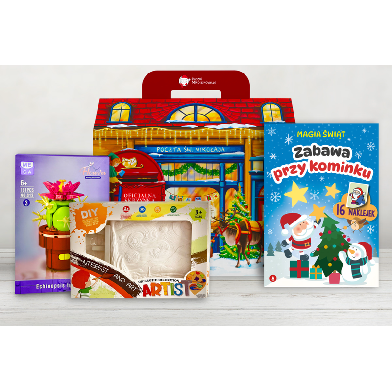 W paczce znajduje się zestaw klocków konstrukcyjnych - kwiatek, który zapewni świetną zabawę i jednocześnie rozwinie kreatywność. Oprócz tego paczka zawiera kreatywny zestaw do malowania, wspierający zdolności manualne i zmysł artystyczny, a także świąteczne ćwiczenia z naklejkami, dające dziecku poczucie satysfakcji z ukończonych zadań i wspierające dalszy rozwój.
