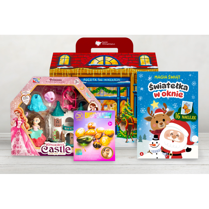 Paczka składa się z zestawu zabawek - Księżniczka i zamek, rozwijającego wyobraźnię, kreatywność i zapewniającego świetną zabawę, oraz kreatywnego zestawu Skamieliny, który uczy cierpliwości, wspiera zdolności manualne i spostrzegawczość. Całość uzupełnia świąteczne ćwiczenia z naklejkami, wspierające dalszy rozwój dziecka.