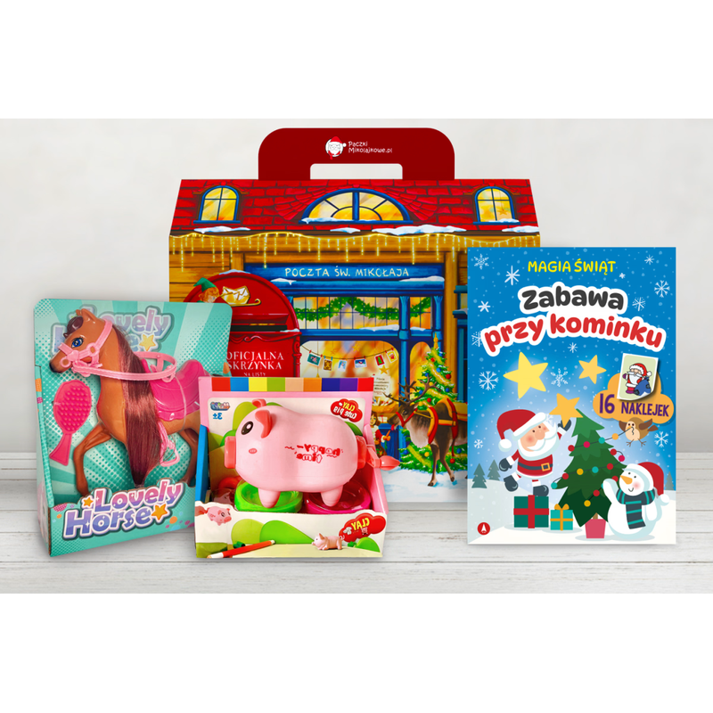 Paczka zawiera konika do czesania, który rozwija wyobraźnię maluszka, uczy cierpliwości i opiekuńczości oraz kształtuje poczucie estetyki. W zestawie znajdują się także kreatywna masa plastyczna oraz świąteczne ćwiczenia z naklejkami, angażujące dziecko w twórcze działanie i wspierające rozwój manualny.