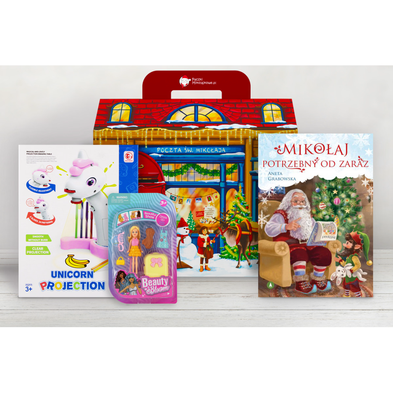Paczka składa się z projektora ułatwiającego rysowanie, który rozwija kreatywność, fantazję i precyzję ruchów, laleczki z zestawem wymiennych ubrań zachęcającej do zabawy oraz uroczej świątecznej bajeczki przenoszącej dziecko w magiczny świat przygód.