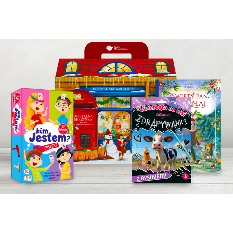 Paczka składa się z edukacyjnej gry logicznej uczącej logicznego myślenia, formułowania wniosków i analizowania informacji, uroczej świątecznej bajeczki pobudzającej wyobraźnię i rozwijającej fantazję dziecka oraz książeczki ze zgadywankami, która rozwija kreatywność i zachęca do twórczego działania.