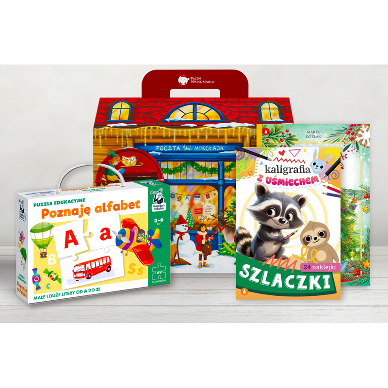 Paczka zawiera puzzle edukacyjne pomagające w poznawaniu literek i pierwszych krokach w nauce czytania, świąteczną bajeczkę umilającą wspólny czas z rodzicami i budującą nawyk czytania oraz ćwiczenia z zadaniami grafomotorycznymi, które wspierają kształtowanie estetycznego pisma.