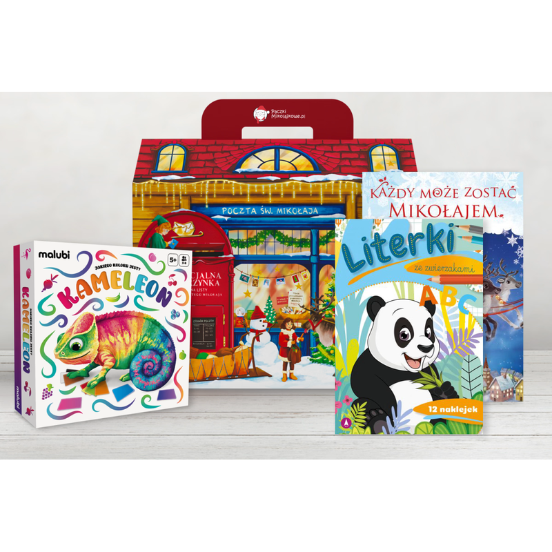 Paczka zawiera edukacyjną grę logiczną wspierającą rozwój myślenia, naukę rozróżniania kolorów i tworzenia skojarzeń, bajeczkę wprowadzającą w świąteczny nastrój oraz pobudzającą fantazję i ciekawość świata dziecka, a także ćwiczenia z naklejkami, które pomagają w nauce pisania i rozpoznawania literek.