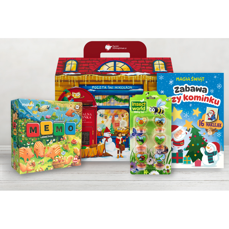 Paczka zawiera grę edukacyjną rozwijającą pamięć i koncentrację, zestaw pieczątek wspierających sprawność manualną malucha oraz ćwiczenia z naklejkami, które dodatkowo rozwijają uwagę i cierpliwość.