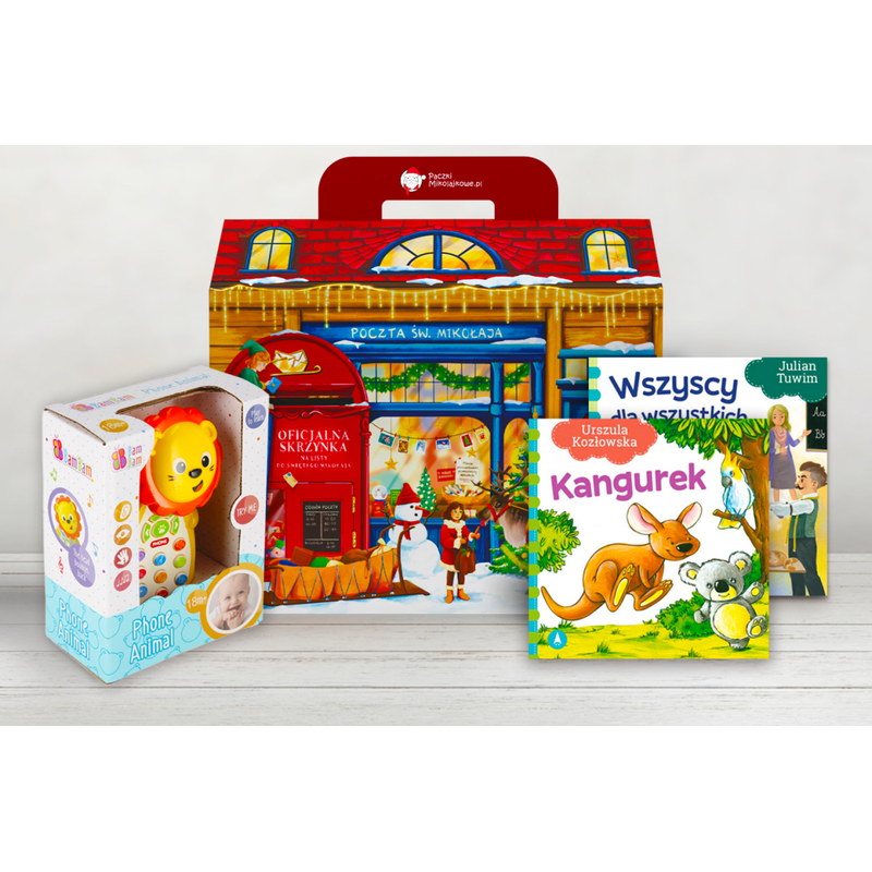 Paczka zawiera interaktywną zabawkę, wspierającą rozwój koordynacji słuchowo-ruchowej maluszka, stymulującą zmysły oraz dwie bajeczki, które poszerzą wiedzę malucha i umilą wspólny czas spędzany z rodzicami.