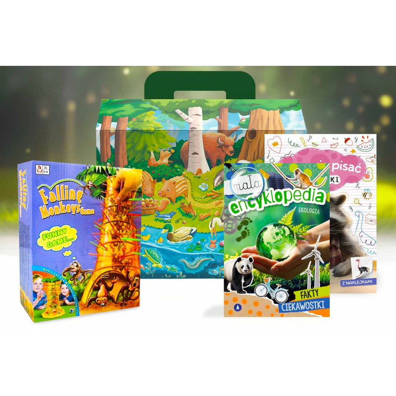 W paczce znajdują się ćwiczenia do nauki pisania liter, kuferkowy zestaw przygód leśnych, edukacyjna gra zręcznościowa dla całej rodziny oraz mała encyklopedia ekologiczna rozwijająca ciekawość świata.