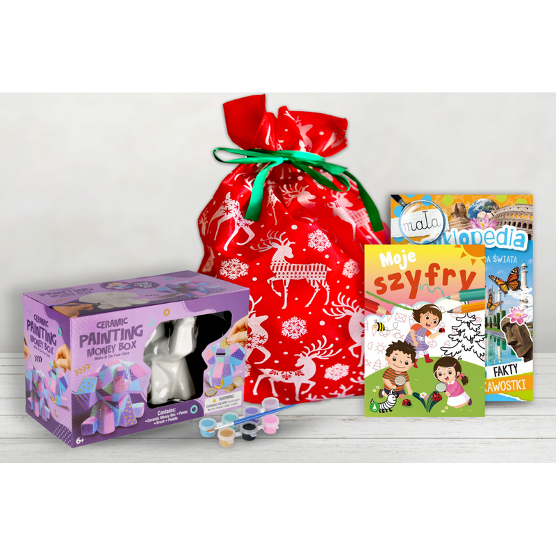 W paczce znajdują się łamigłówki i szyfry, edukacyjna książeczka podróżnicza, świąteczny worek oraz kreatywna skarbonka do malowania, które rozwijają logiczne myślenie, ciekawość świata i zdolności manualne.