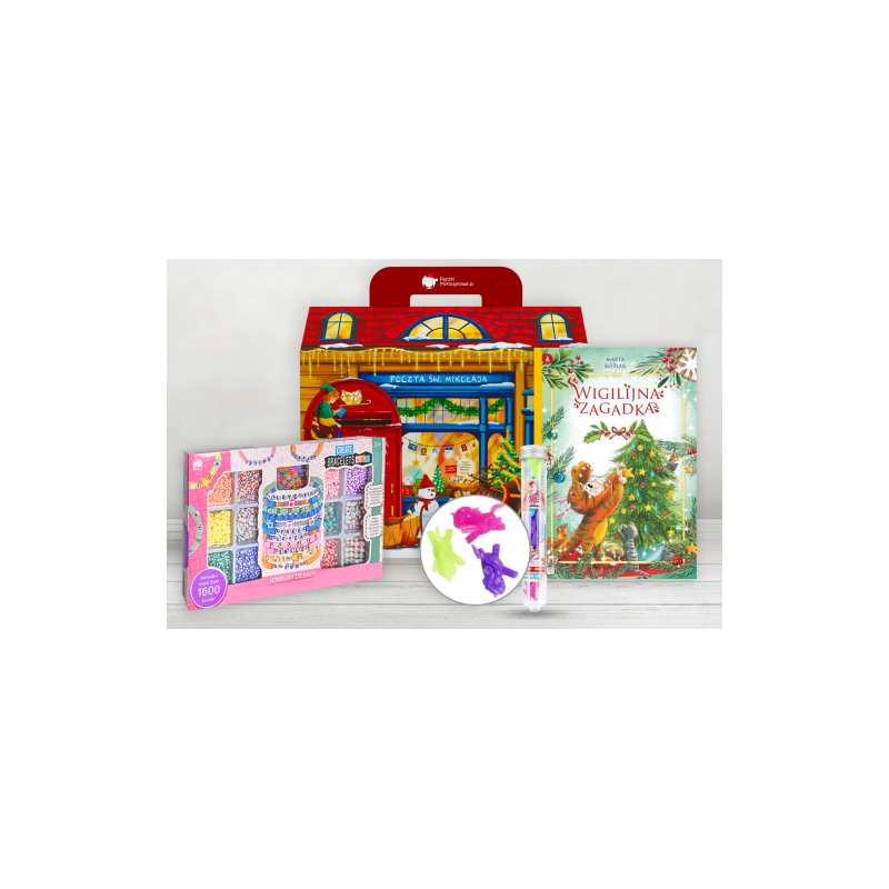 Paczka zawiera wyjątkowy kuferek świąteczny, kreatywny zestaw koralików, barwną grę rodzinną oraz bajeczkę, która wprowadza w świąteczny nastrój i pobudza wyobraźnię. To zestaw pełen magii, zabawy i rozwijających aktywności.