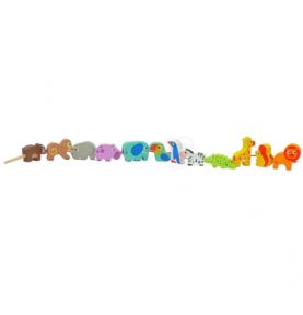 - 12 drewnianych koralików z motywami safari (np. lew, żyrafa, małpka)