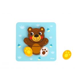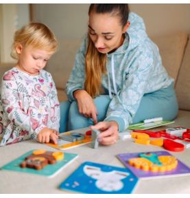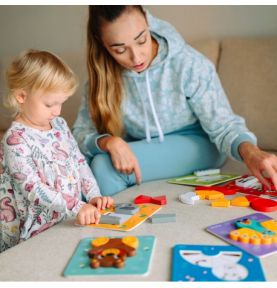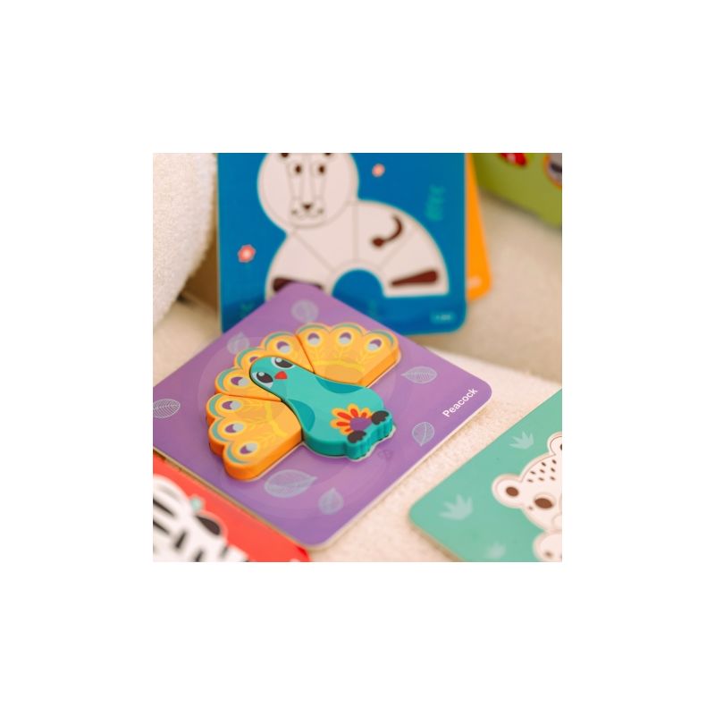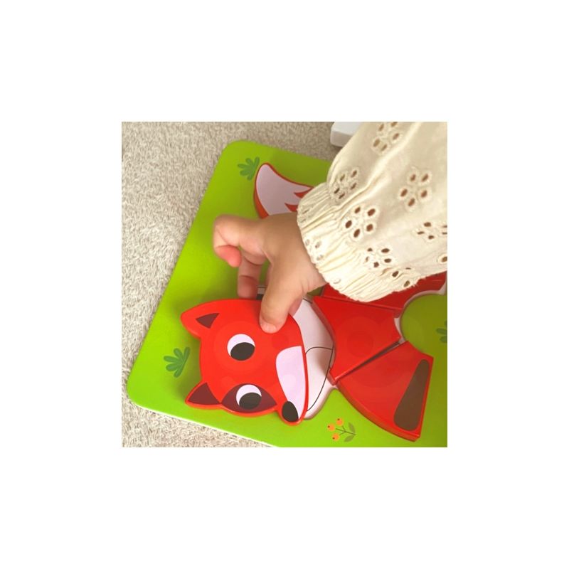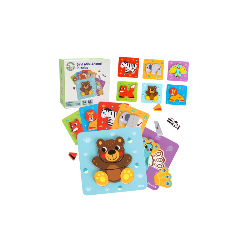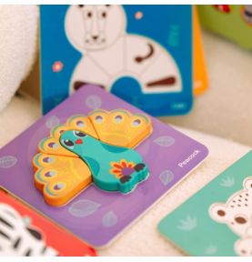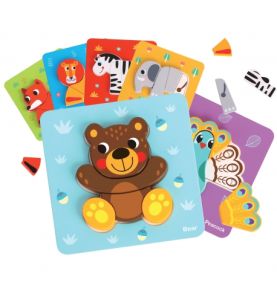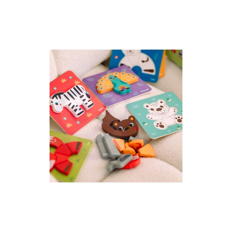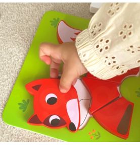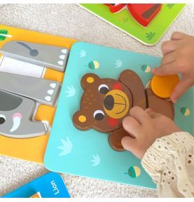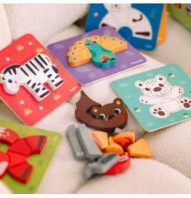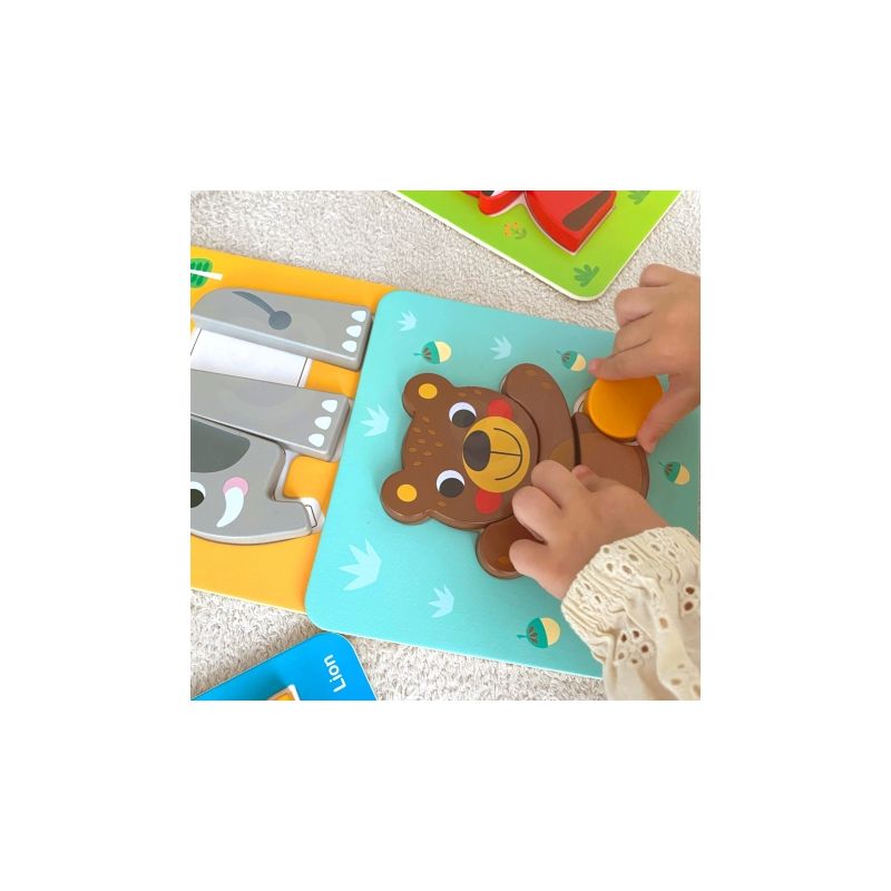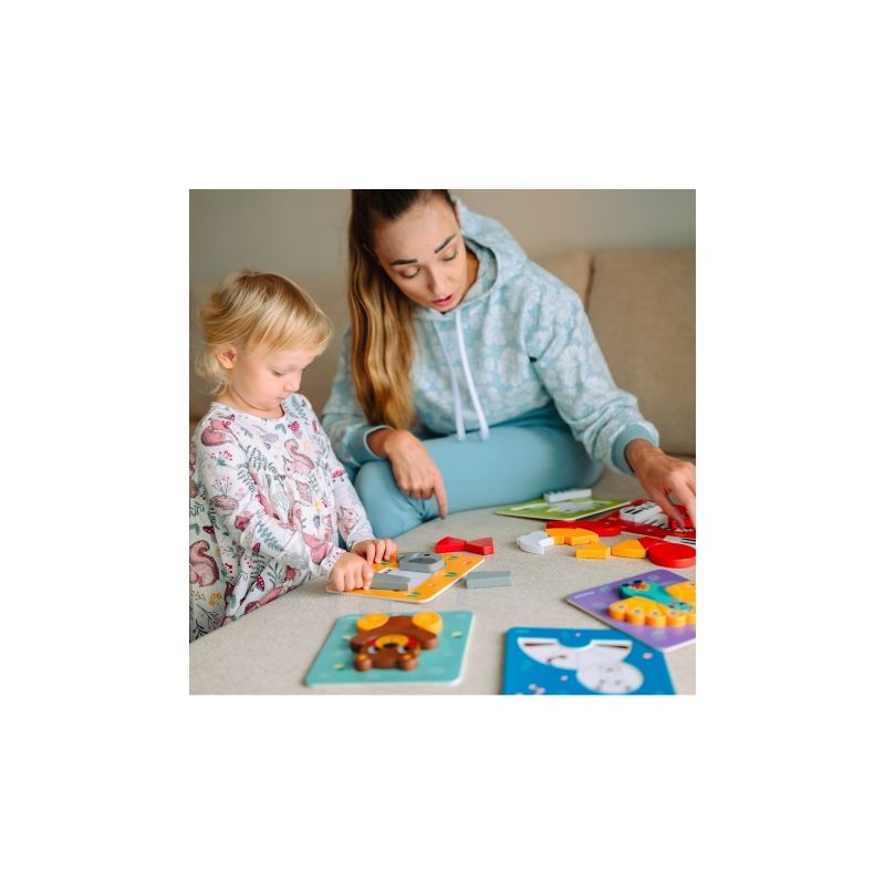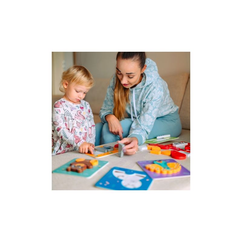Zwierzątka Drewniana Układanka od marki WOOPIE to zestaw składający się z 34 elementów, w tym 6 trwałych, kolorowych kart. Zadaniem dziecka jest dopasowanie dużych, drewnianych elementów, układając je zgodnie ze wzorem, aby ukończyć kolorową układankę. Specjalnie zaprojektowane wgłębienia zapobiegają przesuwaniu się elementów, co ułatwia małym rączkom rozwijanie zdolności motorycznych.