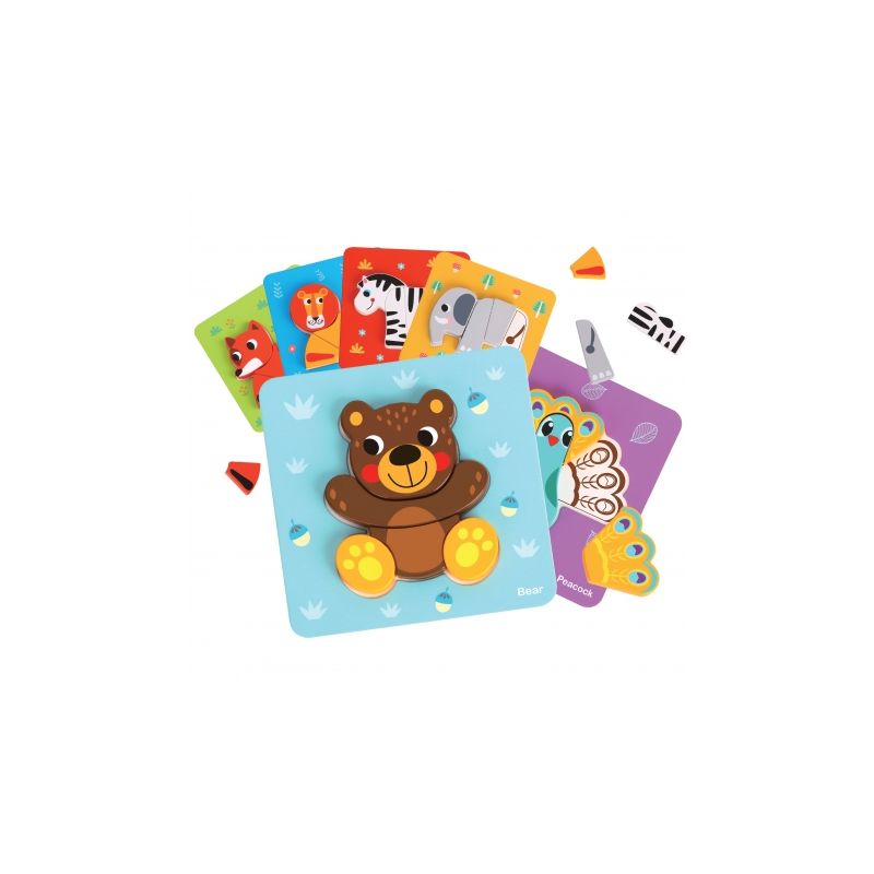 - Puzzle mają różne kształty i kolory, idealnie wpasowujące się w obrazki