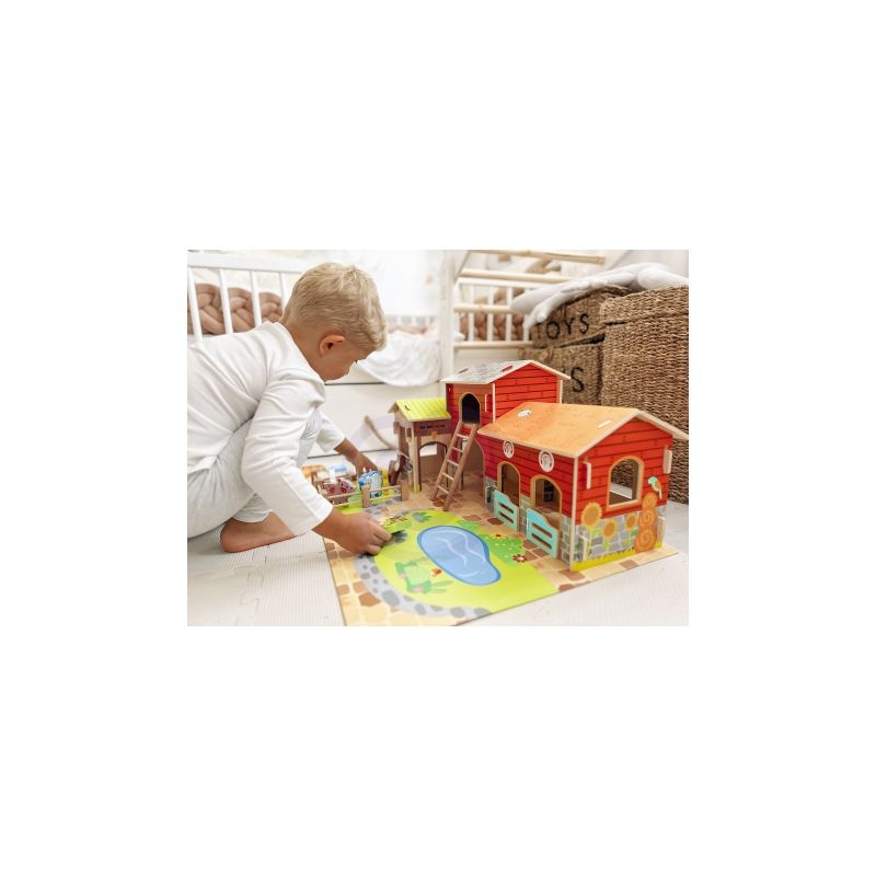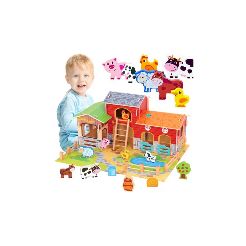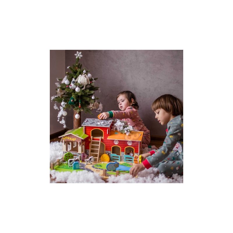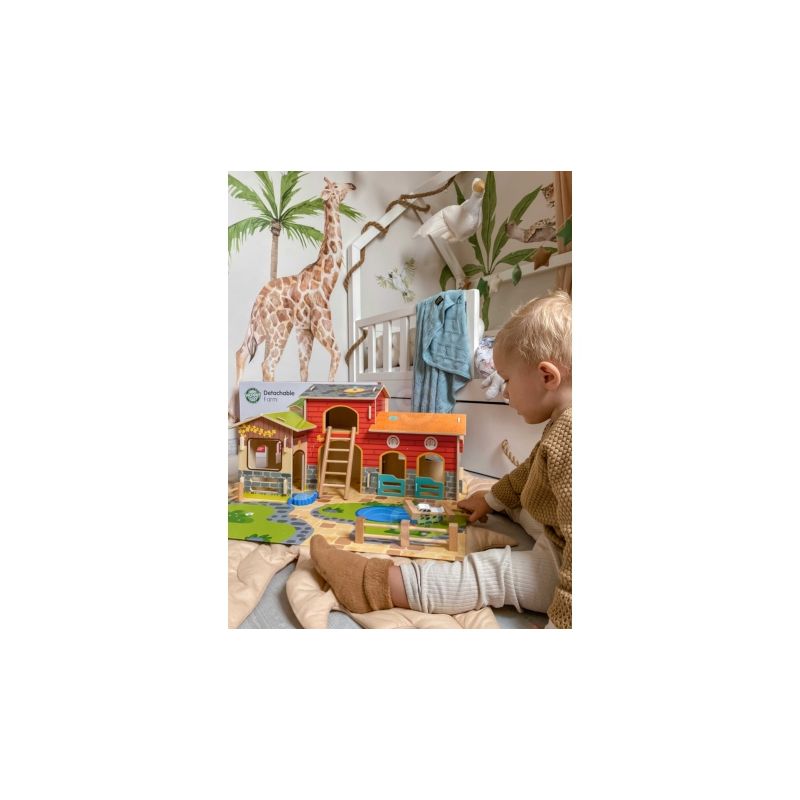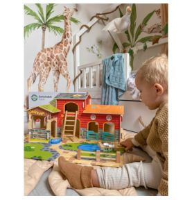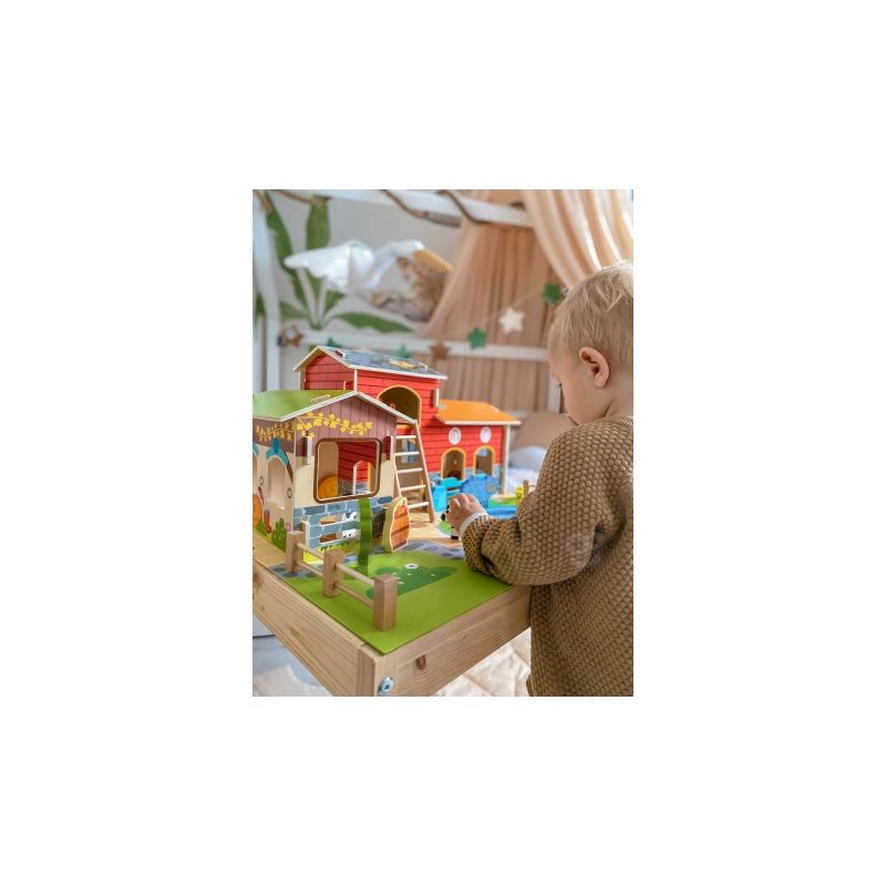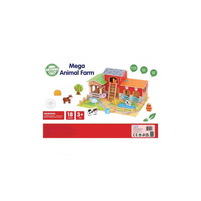 Mega Farma od marki WOOPIE GREEN to wyjątkowa zabawka, która przenosi dzieci w świat wiejskiego gospodarstwa, pełen zwierząt i codziennych obowiązków. Zestaw składa się z 18 elementów, w tym budynków takich jak stajnia, obora i kurnik — idealny do odgrywania ról i kreatywnej zabawy. Przeznaczony dla dzieci od 3 roku życia, wykonany z drewna, wspiera rozwój manualny i wyobraźnię. Dzięki realistycznym detalom maluch może samodzielnie zorganizować farmę, opiekować się zwierzątkami i poznawać przyrodę.