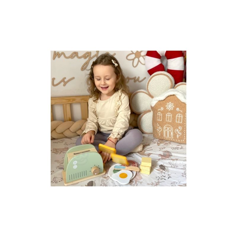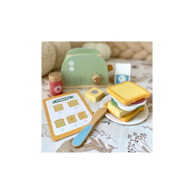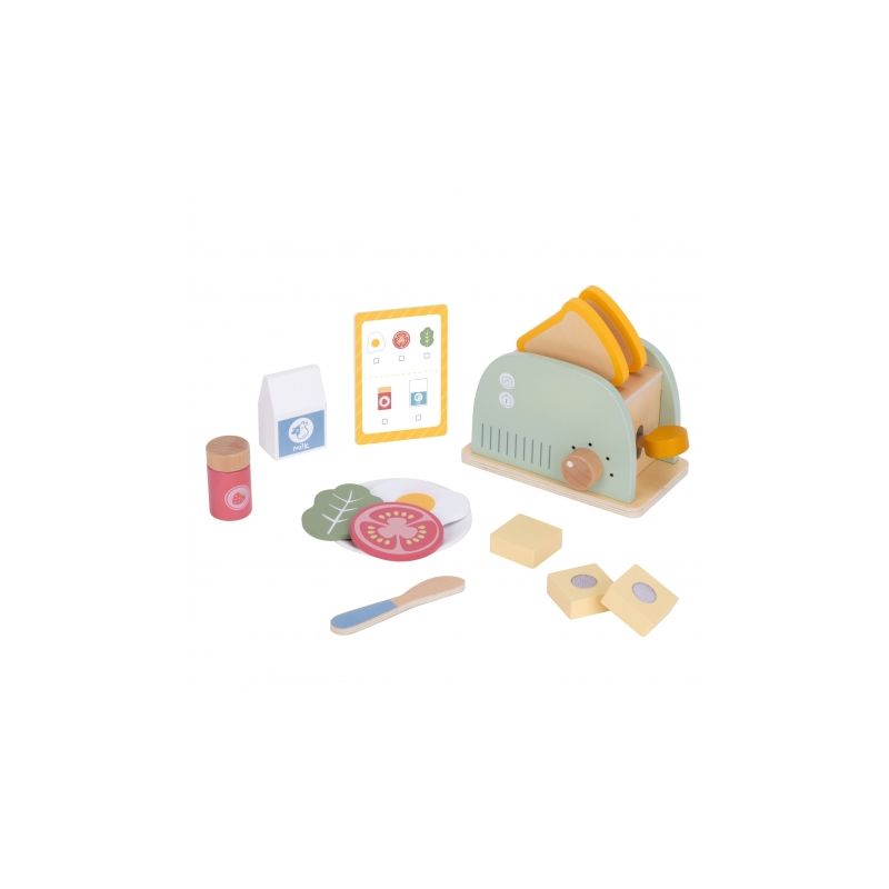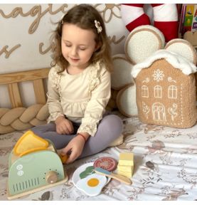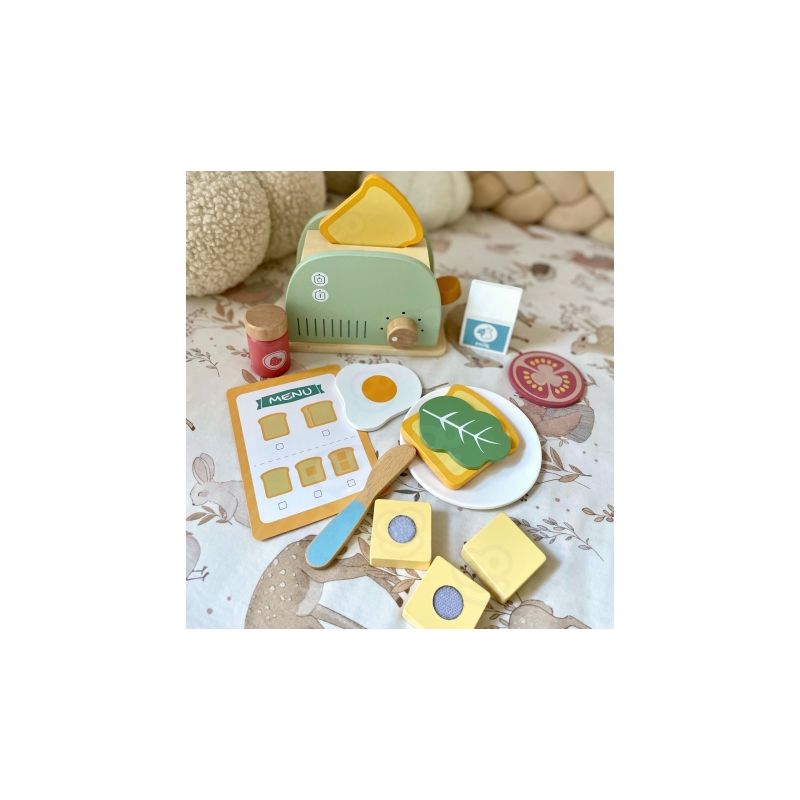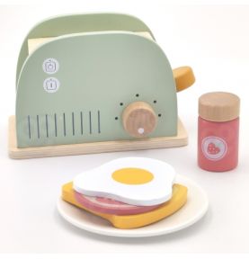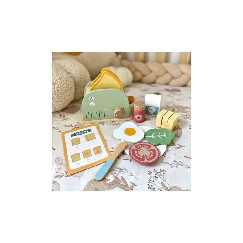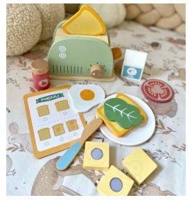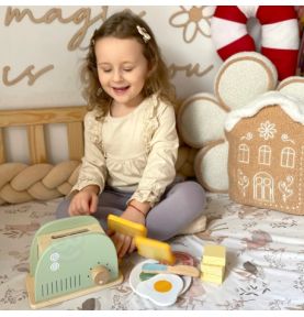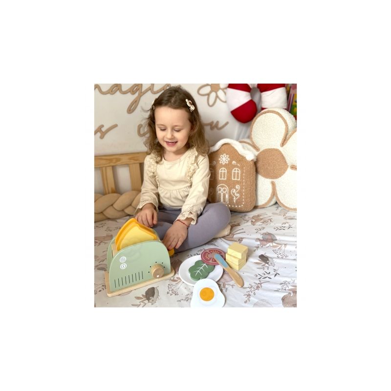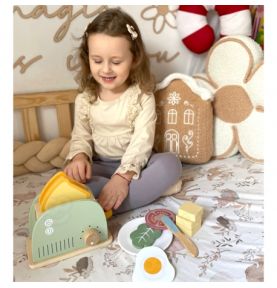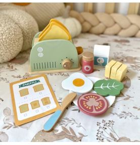 Drewniany zestaw śniadaniowy z tosterem to idealna zabawka dla dzieci, które uwielbiają zabawę w dom, gotowanie i naśladowanie dorosłych. Pozwala przygotować tosty, jajko sadzone czy kanapkę z dodatkami, dzięki czemu dziecko może wcielić się w rolę małego kucharza. Wykonany z bezpiecznego, gładko wykończonego drewna i pomalowany pastelowymi, nietoksycznymi farbami, zestaw wyróżnia się estetyką, trwałością i realizmem. To świetna propozycja zarówno do samodzielnej zabawy, jak i wspólnego gotowania z rodzicem lub rodzeństwem.