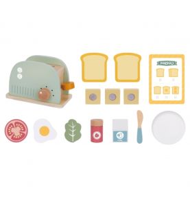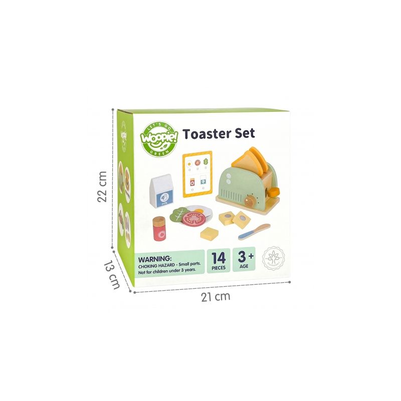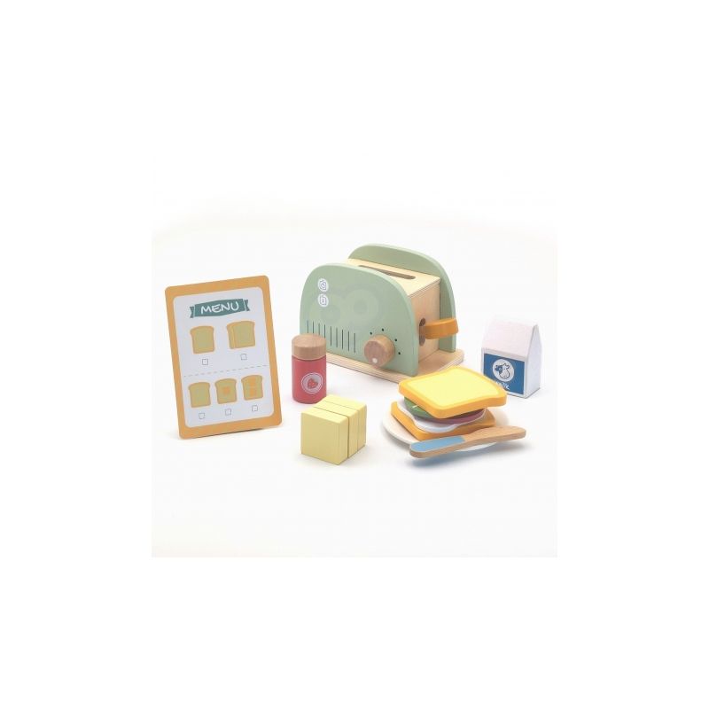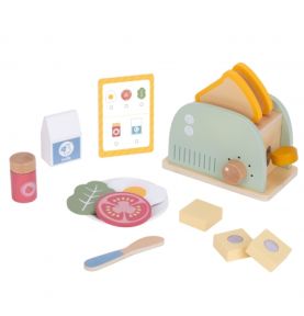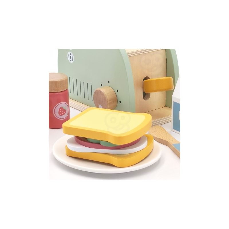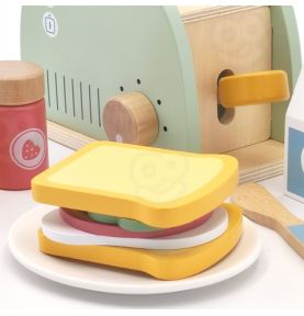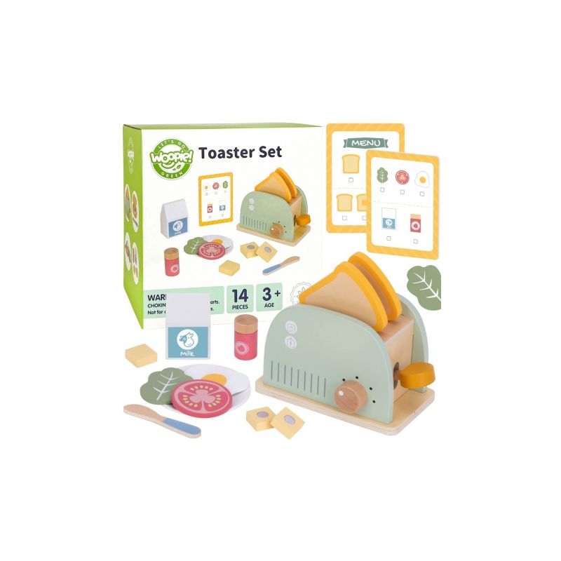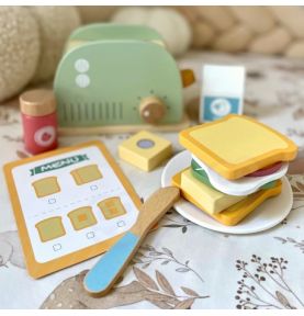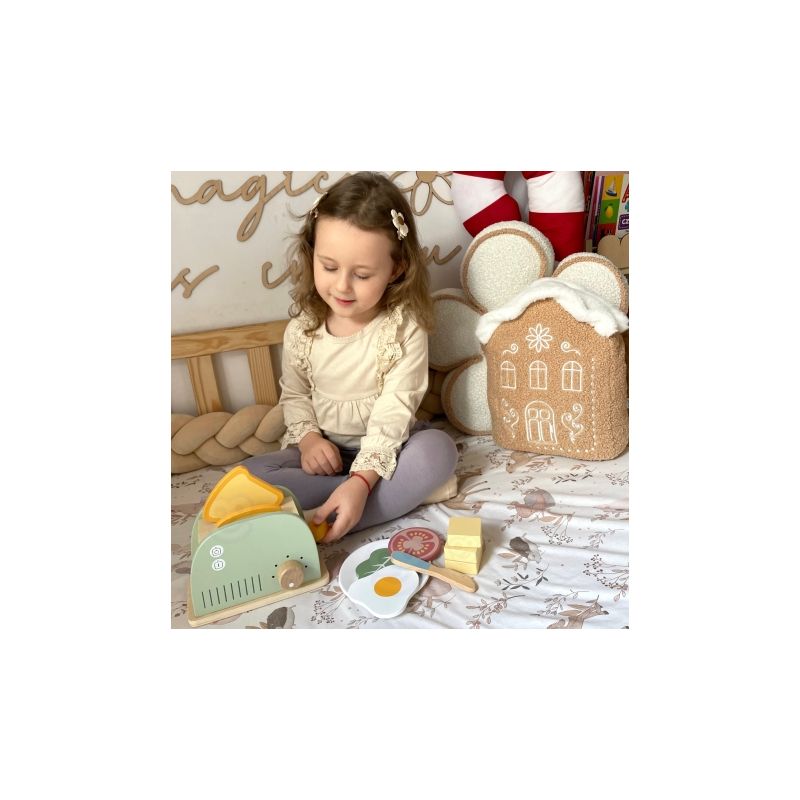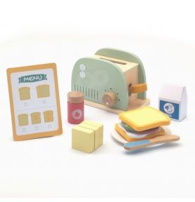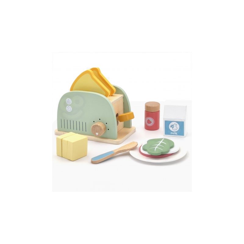 Drewniany zestaw śniadaniowy z tosterem to idealna zabawka dla dzieci, które uwielbiają zabawę w dom, gotowanie i naśladowanie dorosłych. Pozwala przygotować tosty, jajko sadzone czy kanapkę z dodatkami, dzięki czemu dziecko może wcielić się w rolę małego kucharza. Wykonany z bezpiecznego, gładko wykończonego drewna i pomalowany pastelowymi, nietoksycznymi farbami, zestaw wyróżnia się estetyką, trwałością i realizmem. To świetna propozycja zarówno do samodzielnej zabawy, jak i wspólnego gotowania z rodzicem lub rodzeństwem.
