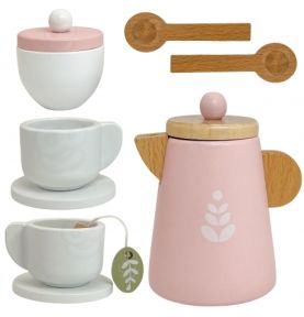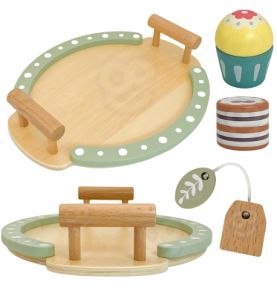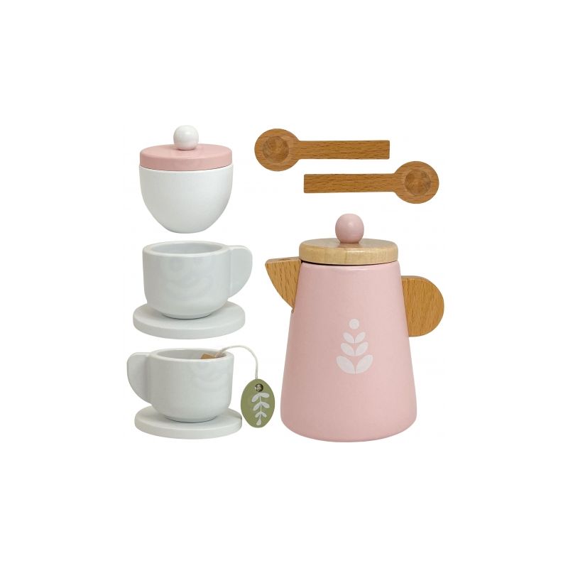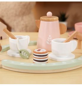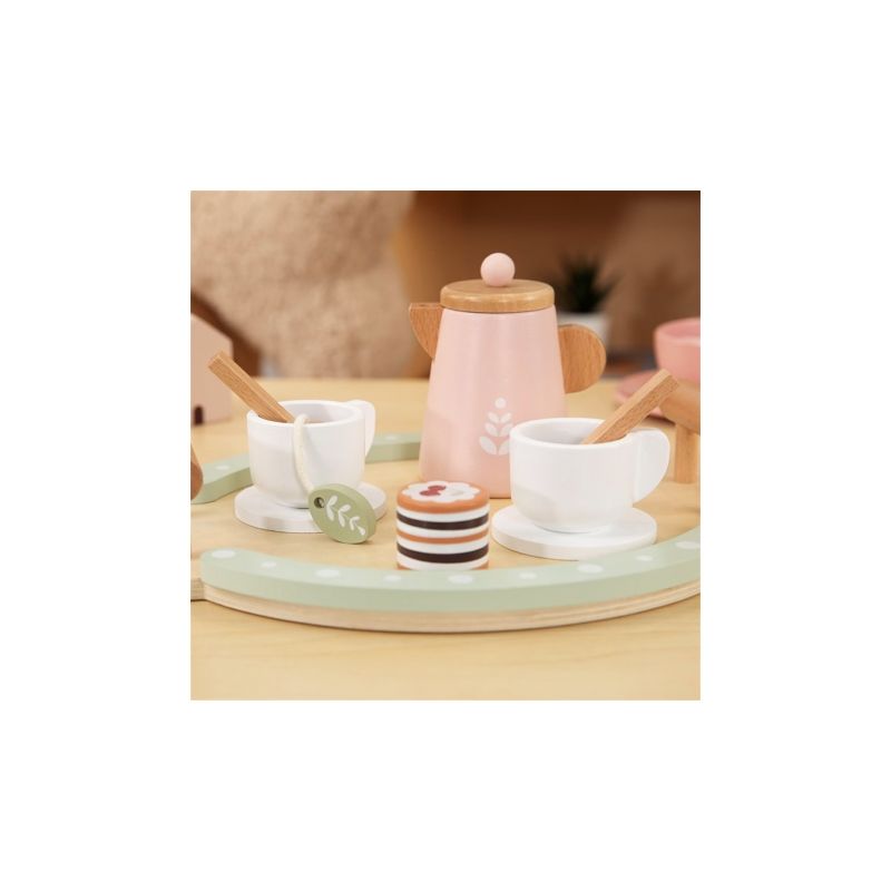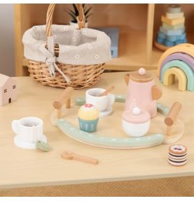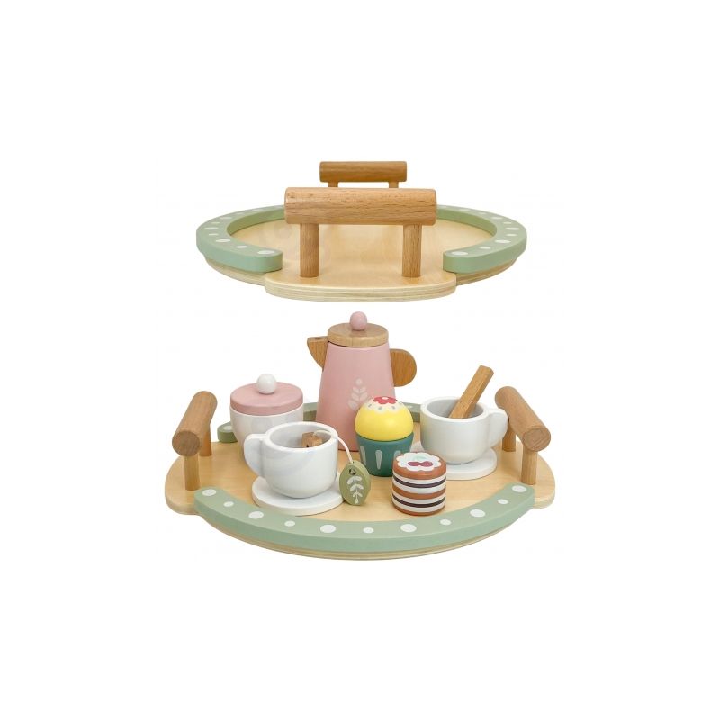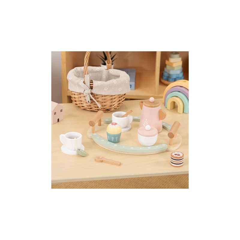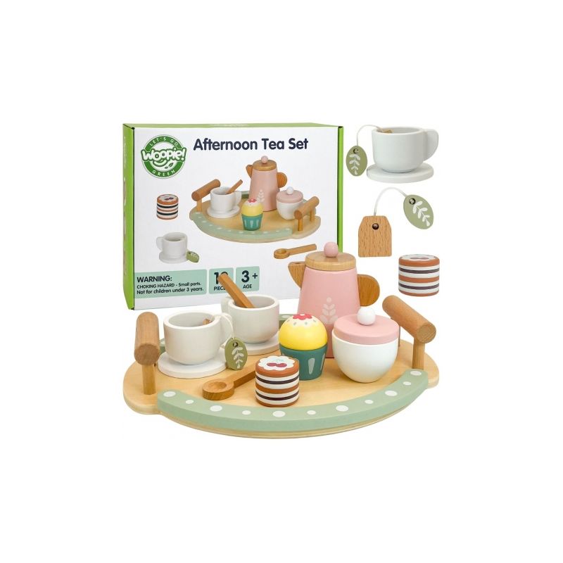 Drewniany zestaw do herbaty Woopie Green – elegancka, pastelowa zabawka dla dzieci od 3 lat. Zestaw rozwija wyobraźnię, kreatywność, zdolności manualne i umiejętności społeczne, umożliwiając zabawę w gospodarza herbacianego przyjęcia.