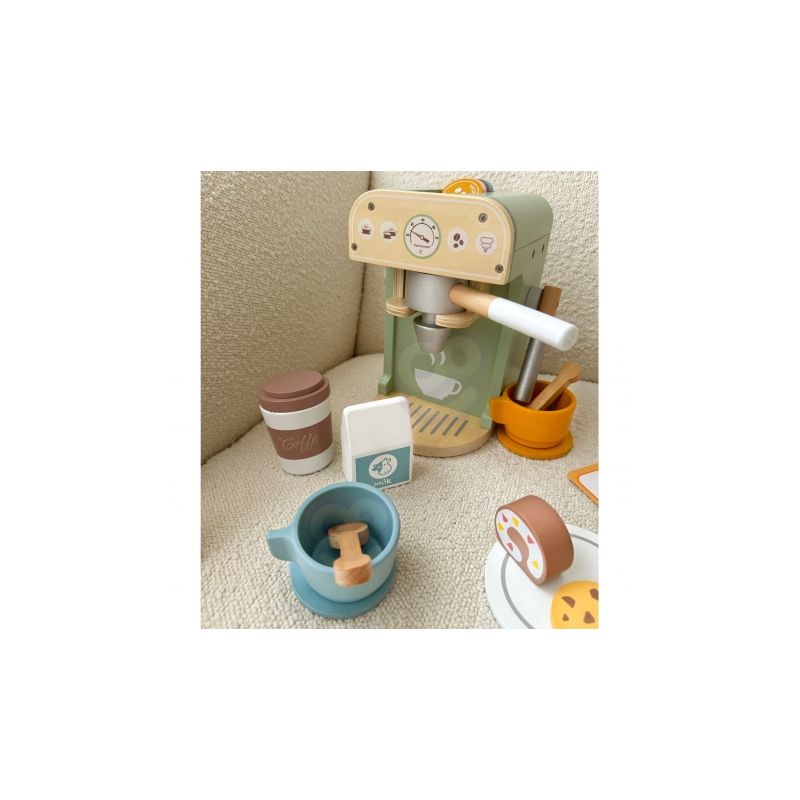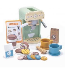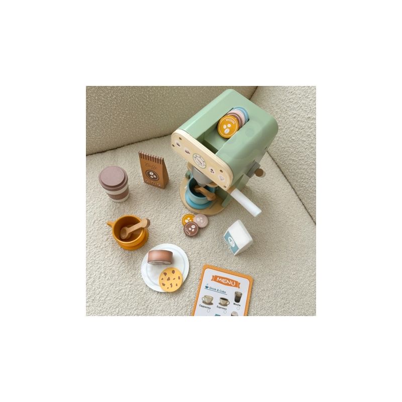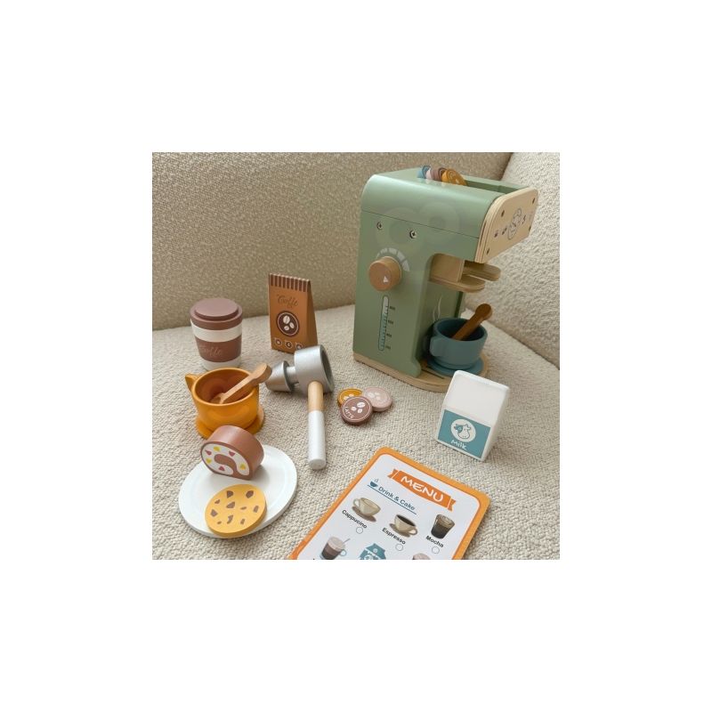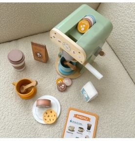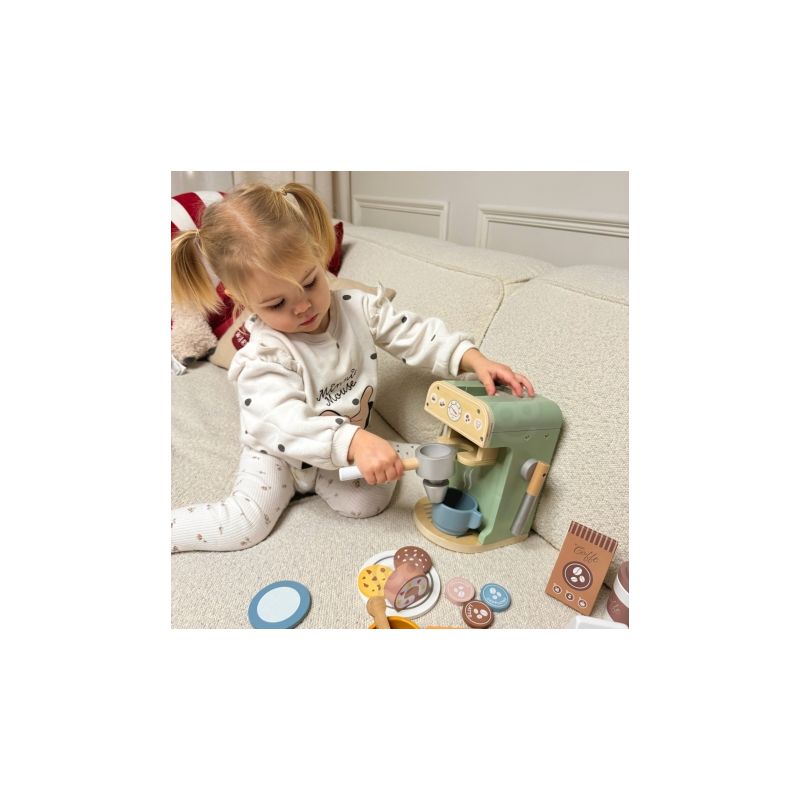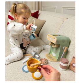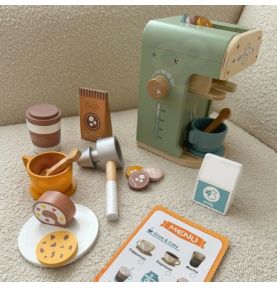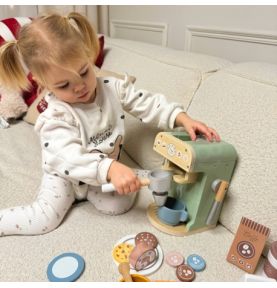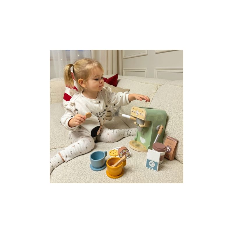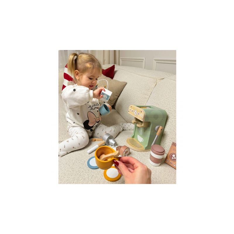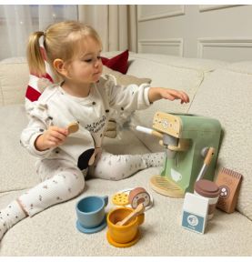 Zabawa w kawiarnię pozwala dzieciom na naukę przez odgrywanie ról. Zestaw składa się z 25 elementów, w tym ekspresu, filiżanek, kapsułek i akcesoriów, co pozwala na kreatywną zabawę i rozwój manualny. Wykonany z naturalnego drewna i bezpiecznych farb, łączy realistyczny wygląd z bezpieczeństwem.