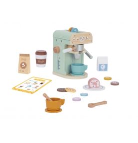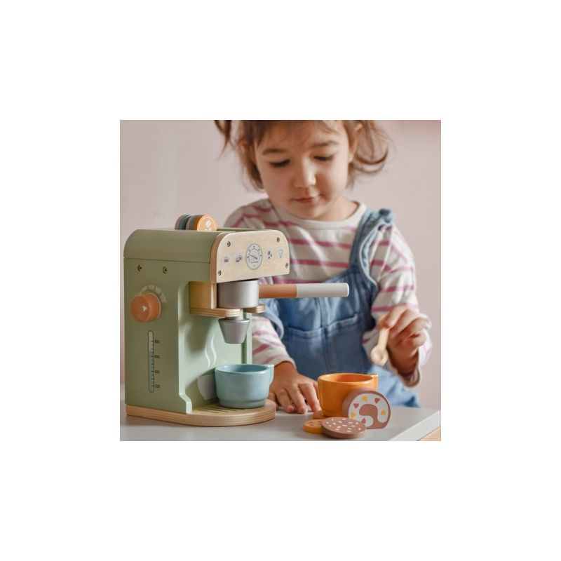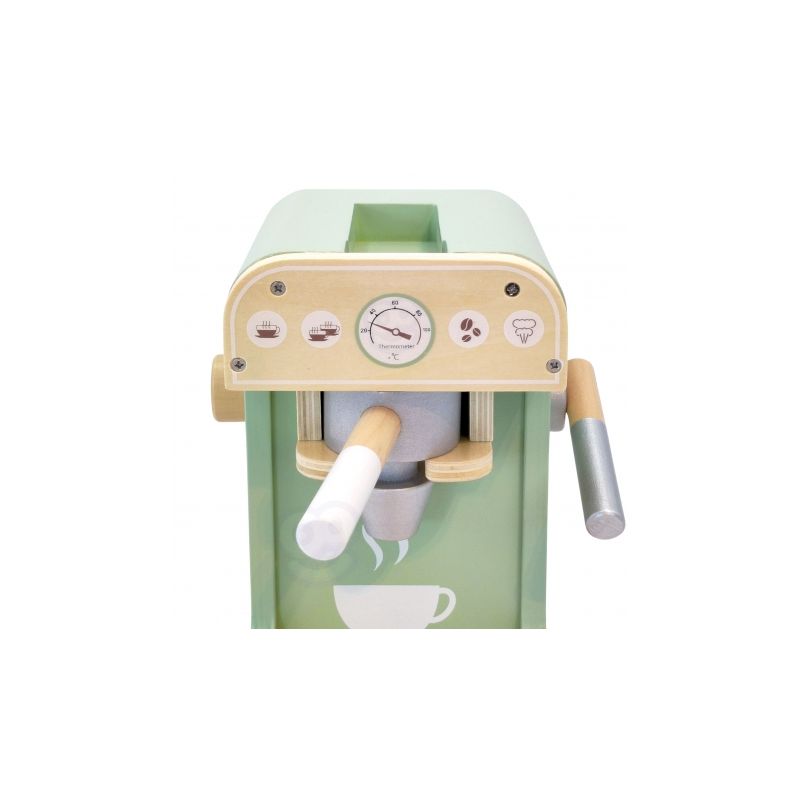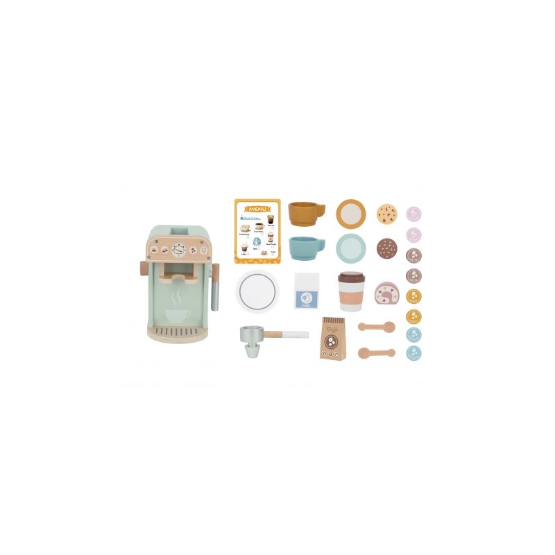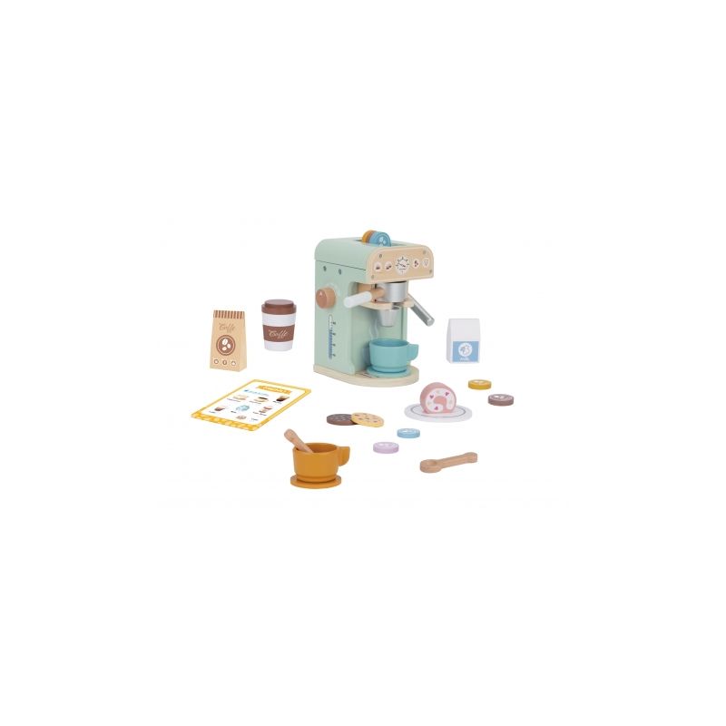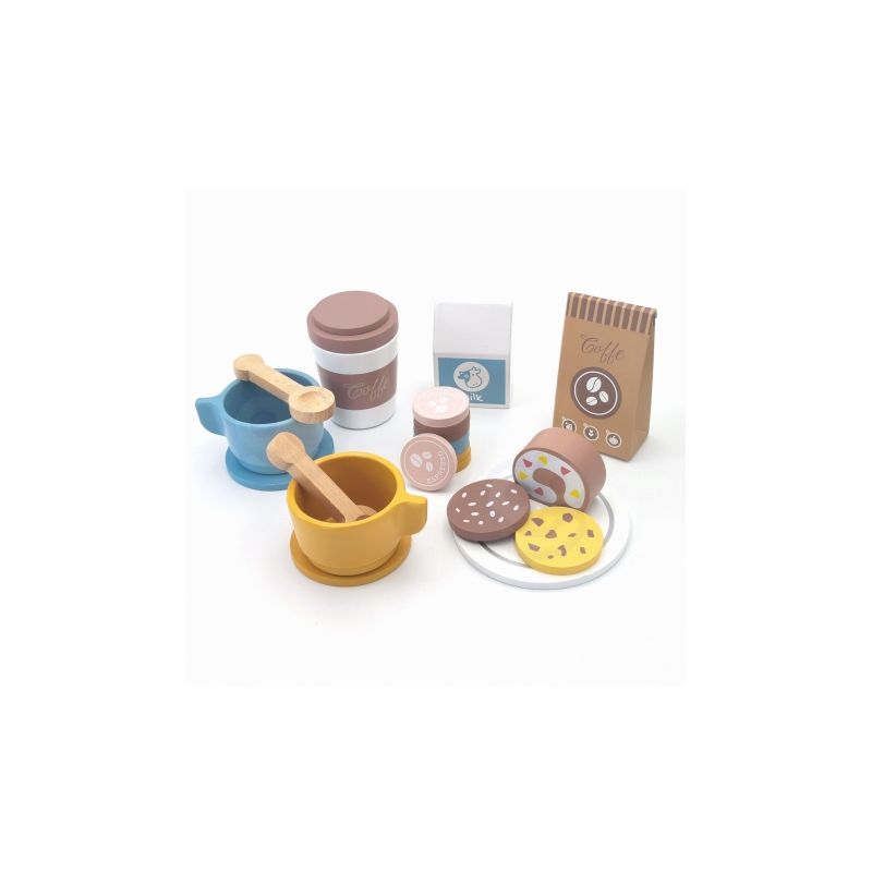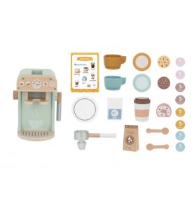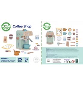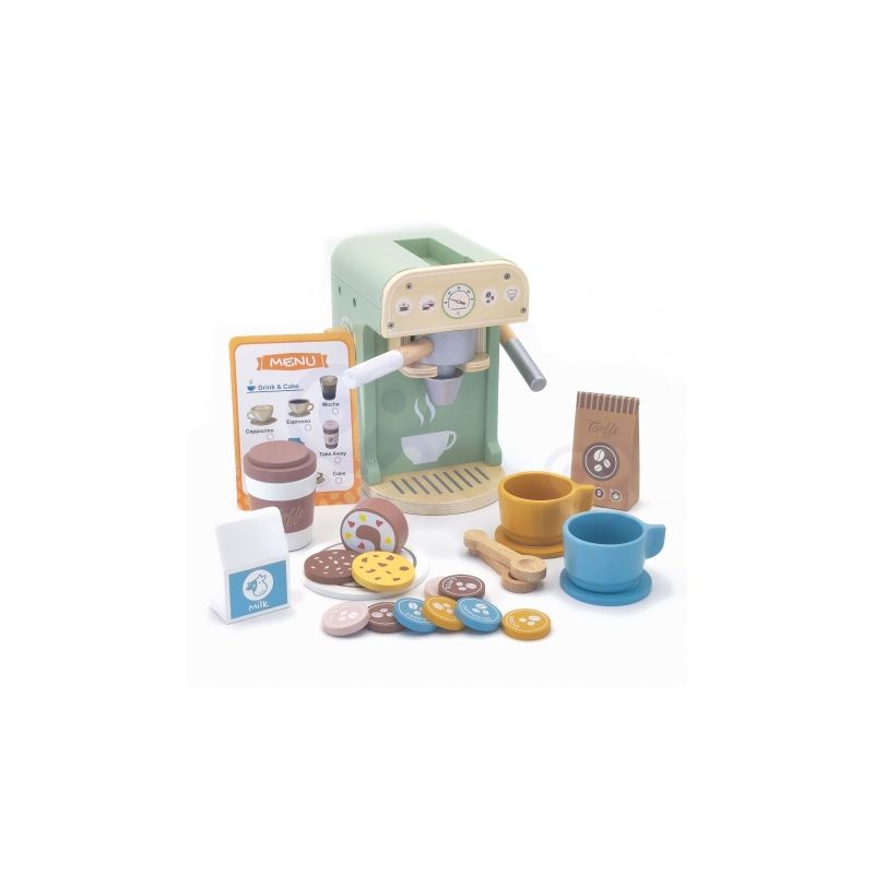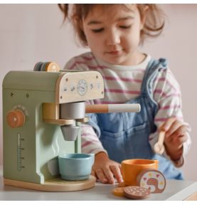 Zabawa w kawiarnię pozwala dzieciom na naukę przez odgrywanie ról. Zestaw składa się z 25 elementów, w tym ekspresu, filiżanek, kapsułek i akcesoriów, co pozwala na kreatywną zabawę i rozwój manualny. Wykonany z naturalnego drewna i bezpiecznych farb, łączy realistyczny wygląd z bezpieczeństwem.