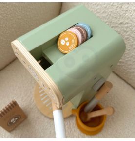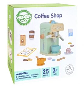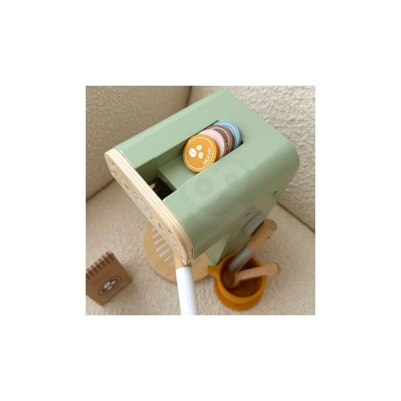 Drewniany Ekspres do Kawy Woopie Green – kreatywna zabawka z 25 elementami, pozwalająca dzieciom wcielić się w rolę baristy. Rozwija zdolności manualne, wyobraźnię i koncentrację.