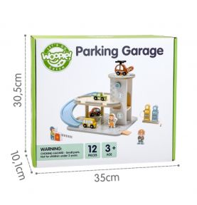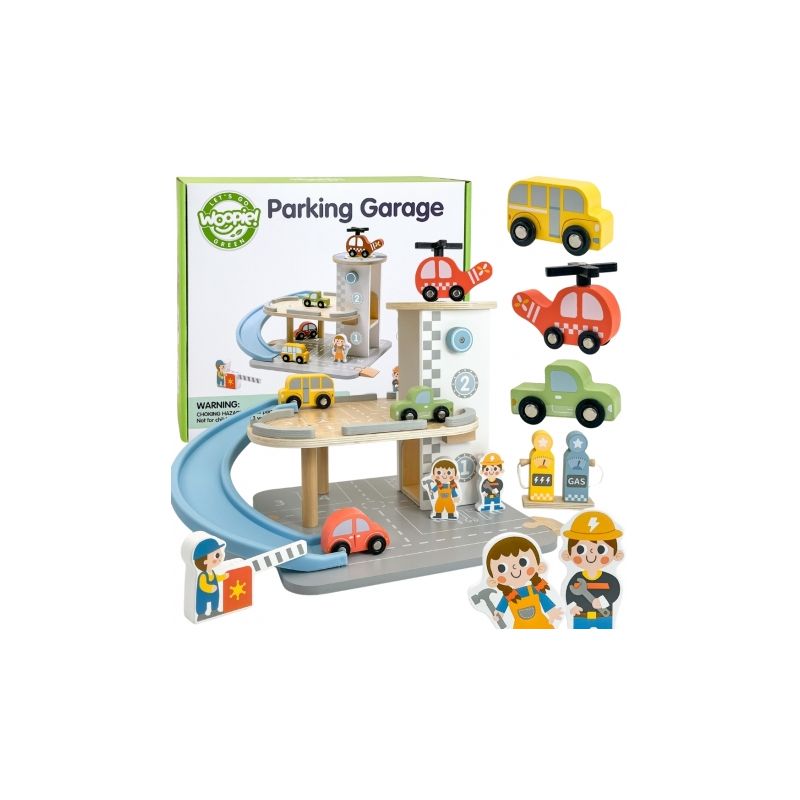 Wielopoziomowy Drewniany Parking Woopie Green – kolorowe samochody, helikopter z obrotowym śmigłem i figurki pracowników zapewniają godziny kreatywnej zabawy, rozwijając wyobraźnię, kreatywność i motorykę dziecka.