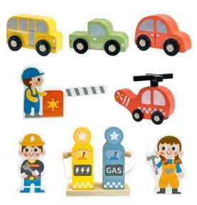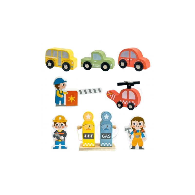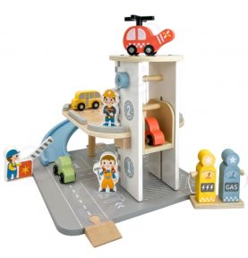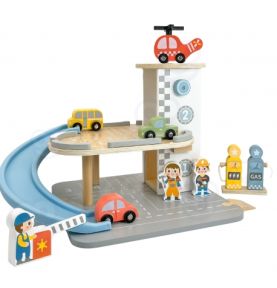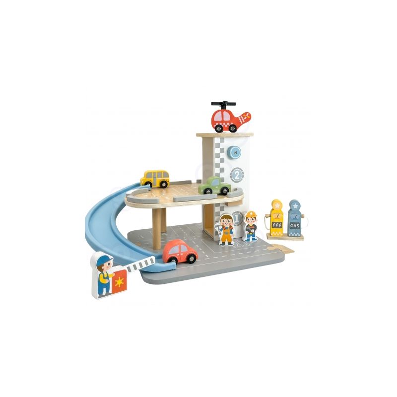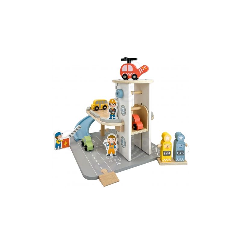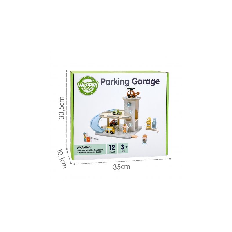 WOOPIE GREEN Drewniany Parking Piętrowy 2w1 Stacja Benzynowa z Autkami i Figurkami 12 el. FSC