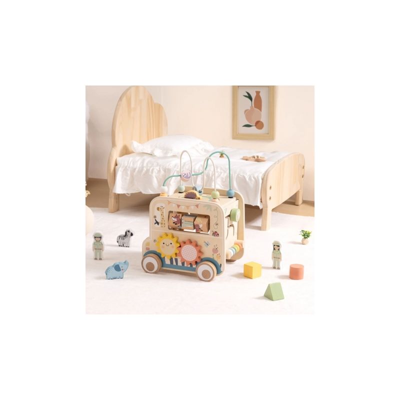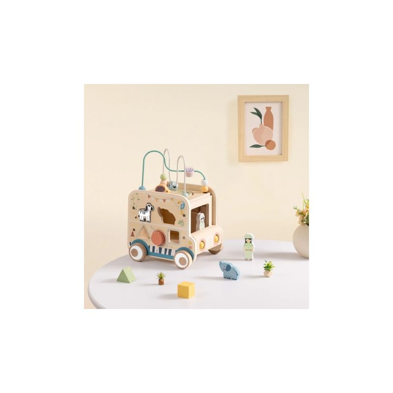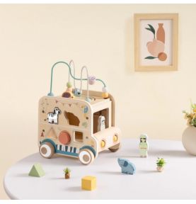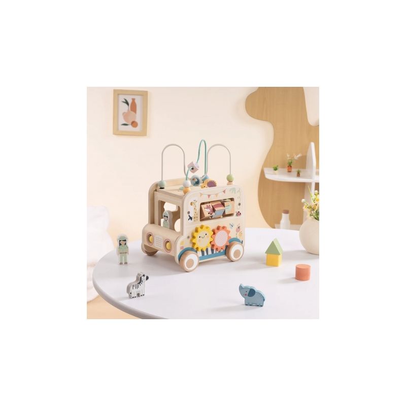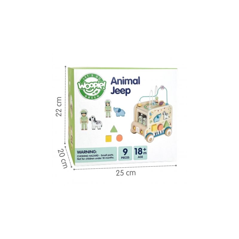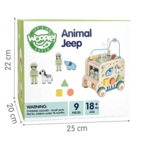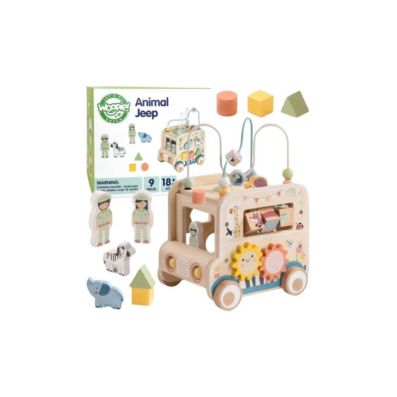 Odkryj świat przygody z drewnianą kostką aktywności stylizowaną na samochód terenowy safari! Zabawka łączy w sobie ruchome elementy, labirynty i sorter kształtów, wspierając rozwój dziecka poprzez zabawę, kreatywność i eksperymentowanie.