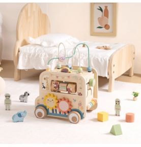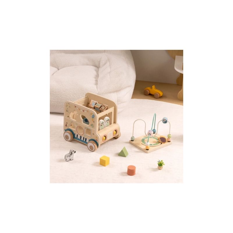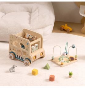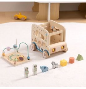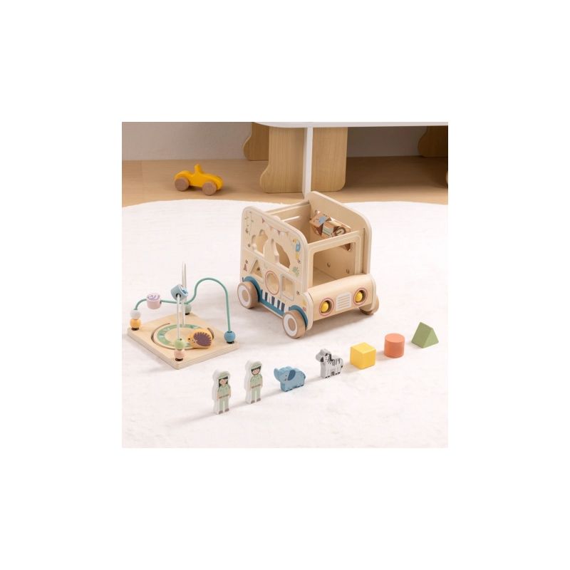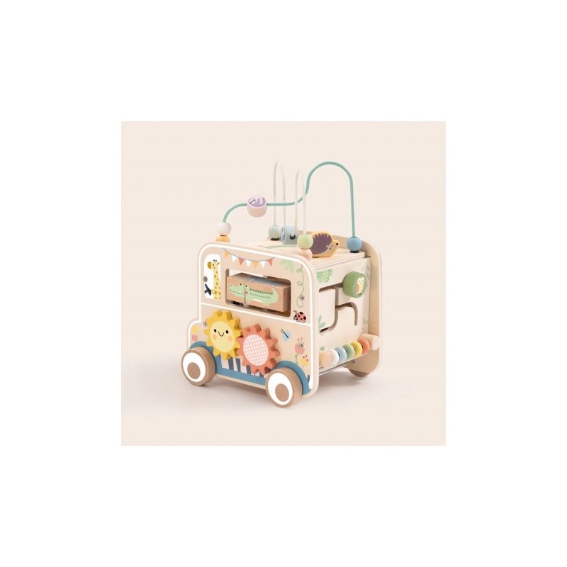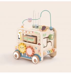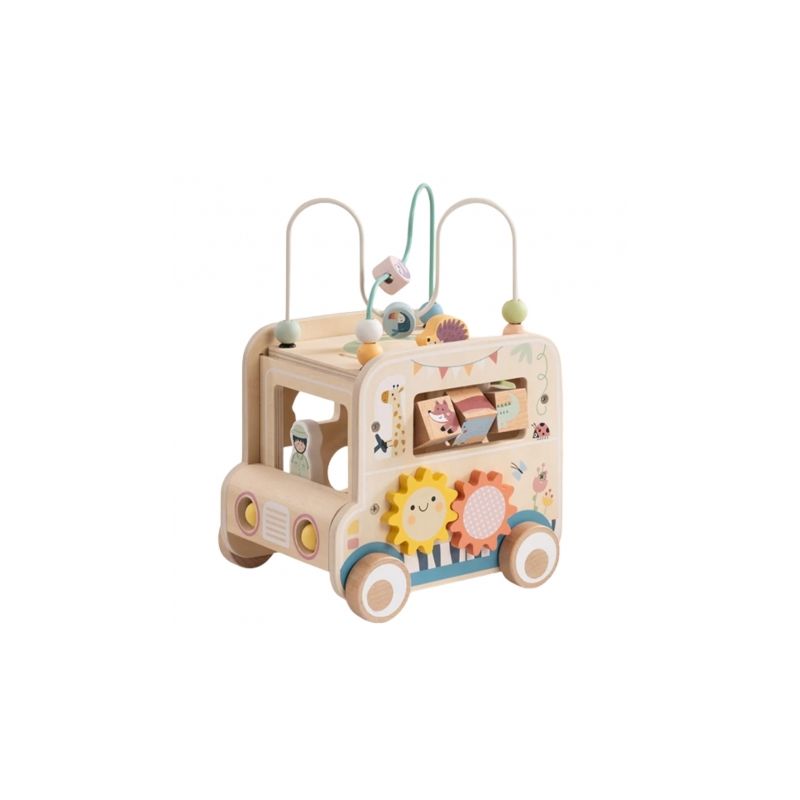 Odkryj świat przygody z drewnianą kostką aktywności stylizowaną na samochód terenowy safari! Zabawka łączy w sobie ruchome elementy, labirynty i sorter kształtów, wspierając rozwój dziecka poprzez zabawę, kreatywność i eksperymentowanie.