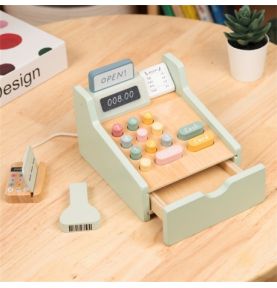 Urocza drewniana kasa fiskalna z akcesoriami – skanerem, czytnikiem kart, monetami i banknotami. Idealna do zabawy w sklep, kawiarnię lub piekarnię, rozwija motorykę, logiczne myślenie i kreatywność.