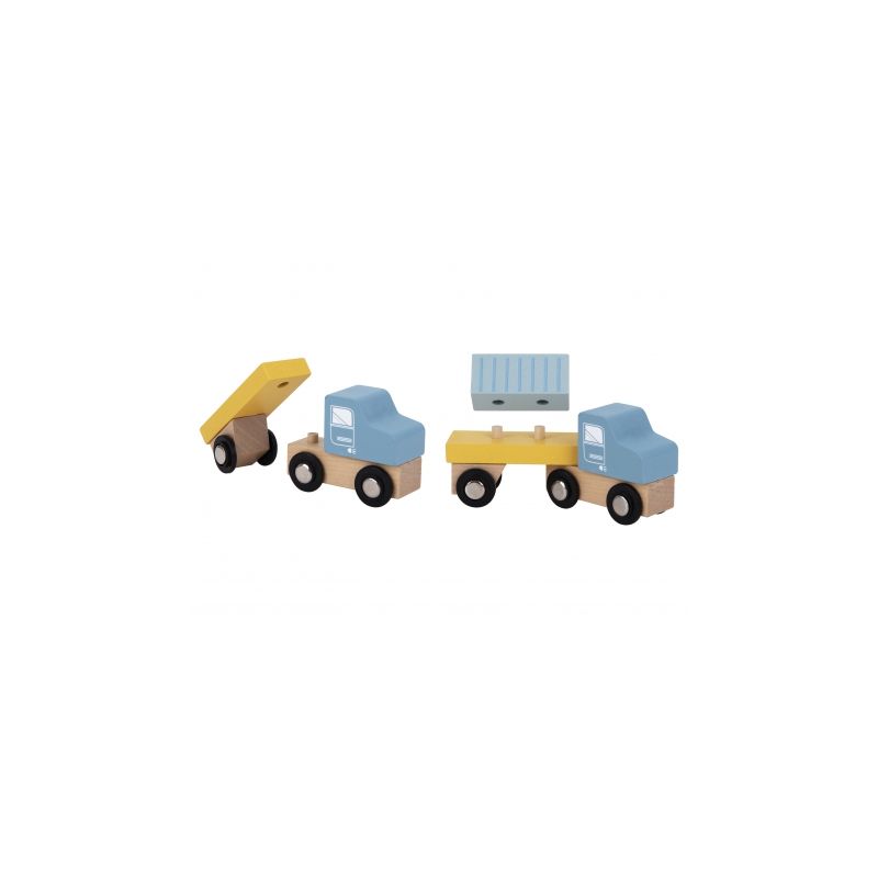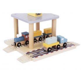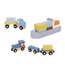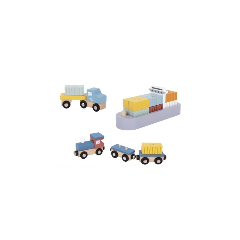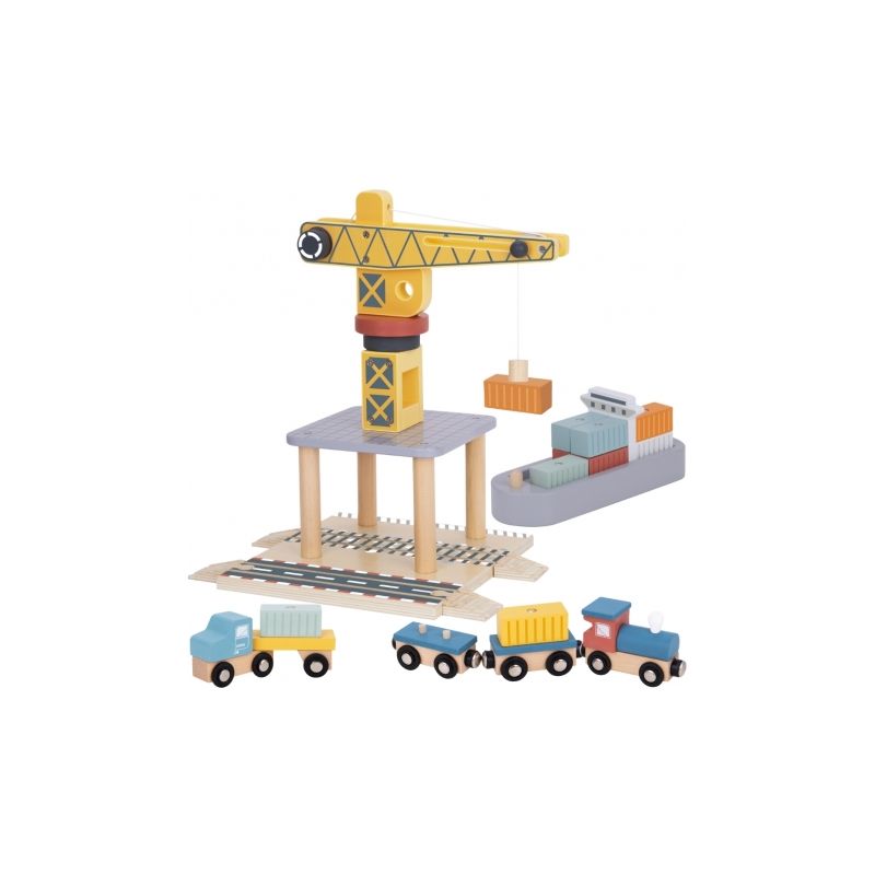 Drewniany zestaw portowy z dźwigiem, pociągiem, ciężarówką i statkiem, rozwijający motorykę, koordynację oraz wyobraźnię, idealny dla dzieci od 3 lat.
