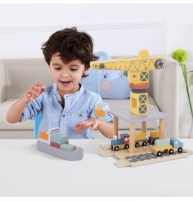 Drewniany Zestaw Portowy Tooky Toy – zestaw z dźwigiem, pociągiem, ciężarówką i statkiem. Rozwija motorykę, koordynację, wyobraźnię i kreatywność podczas zabawy w port.