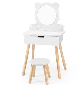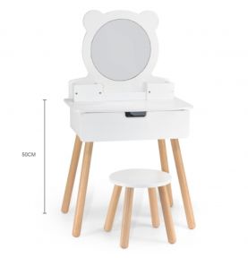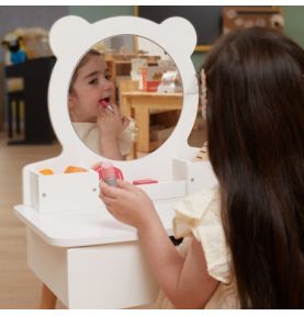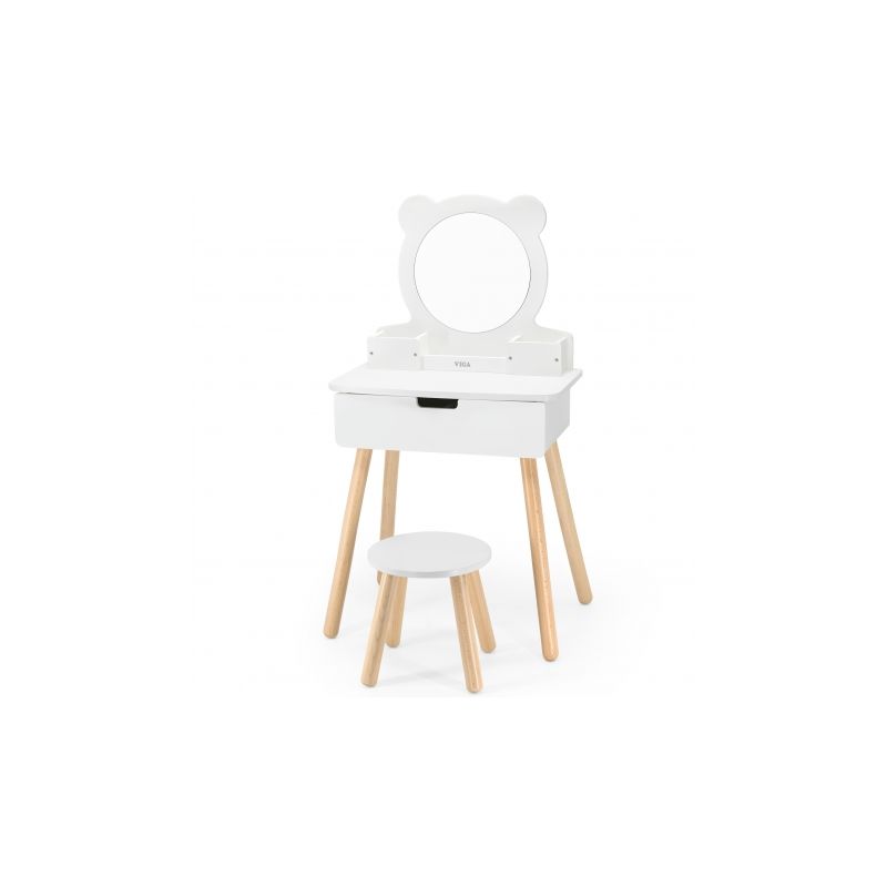 Duża Toaletka Viga – wolnostojąca, biała toaletka z wysuwaną szufladą i lustrem, wraz z krzesełkiem. Rozwija kreatywność, zręczność, wyobraźnię i koordynację ręka-oko.