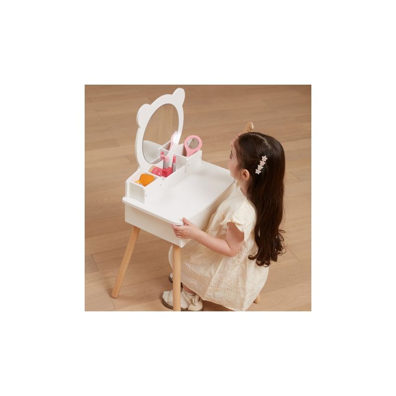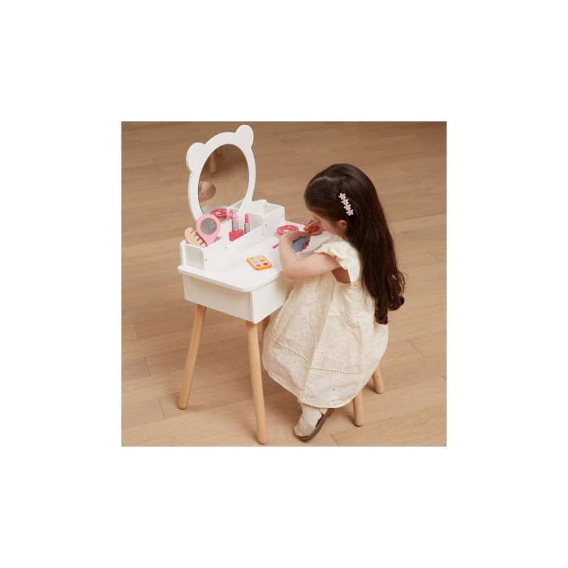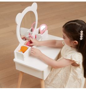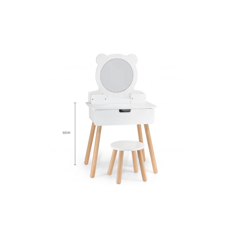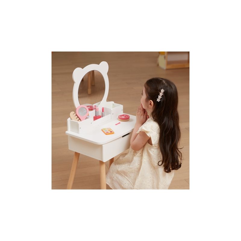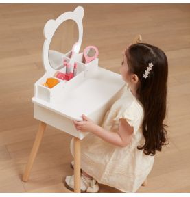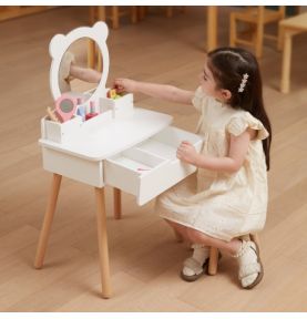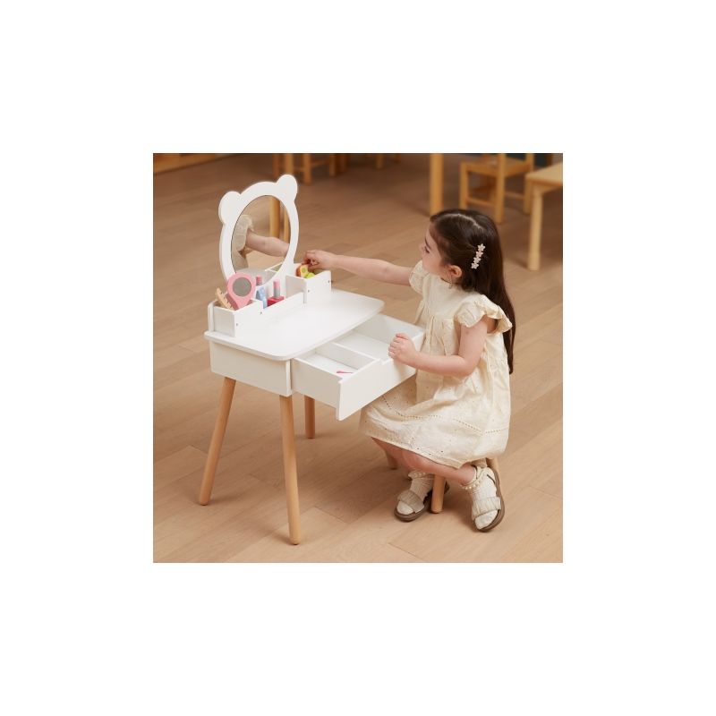 Elegancka drewniana toaletka z lustrem i szufladą, w komplecie z krzesełkiem — idealna do zabawy w stylizację i tworzenia własnego kącika piękności.