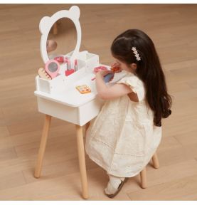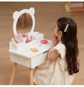 Duża wolnostojąca biała toaletka od VIGA to wymarzony mebel dla każdej małej księżniczki. Wyposażona w praktyczną szufladę oraz przegródki na drobiazgi pod lustrem, zapewnia miejsce na wszystkie „skarby”. Solidnie wykonana z drewna i pomalowana bezpiecznymi, nietoksycznymi farbami zachwyca estetyką i trwałością. W zestawie znajduje się również wygodne krzesełko, dzięki czemu toaletka tworzy idealne miejsce do zabawy w odgrywanie ról.
