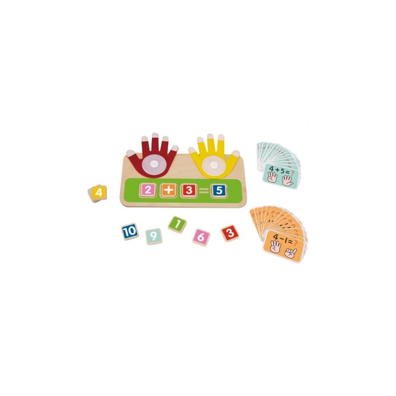 Drewniana edukacyjna zabawka z ruchomymi dłońmi i klockami, pomagająca dzieciom w nauce dodawania i odejmowania poprzez zabawę.