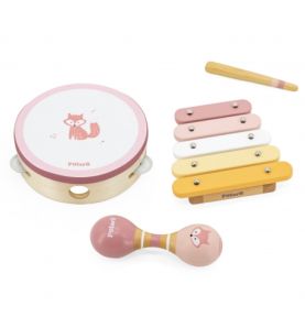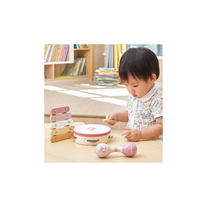 Wprowadź dziecko w świat muzyki dzięki różowemu zestawowi instrumentów od Viga! W komplecie znajdują się trzy lekkie, bezpieczne instrumenty: tamburyn, cymbałki i marakas. Każdy wykonany z trwałego drewna i pomalowany nietoksycznymi farbami. Zestaw idealny dla dzieci od 2 lat, które chcą odkrywać rytm, muzykę i rozwijać wrażliwość słuchową.