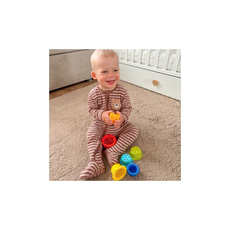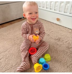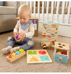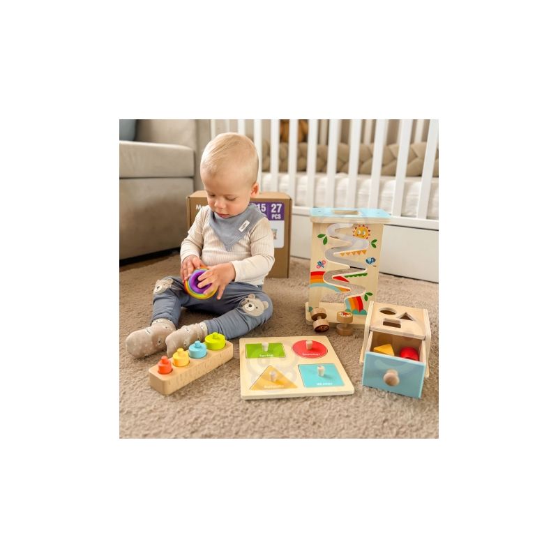 Drewniany Box Montessori 6w1 od Woopie Green to wszechstronny zestaw edukacyjny stworzony z myślą o dzieciach ok. 13–15 miesięcy. Zawiera aż sześć różnych zabawek sensorycznych, które wspierają rozwój dziecka zgodnie z metodą Montessori. Maluch może samodzielnie eksplorować, dopasowywać, manipulować i odkrywać zależności przyczynowo-skutkowe, a rodzic zyskuje praktyczne narzędzie do wartościowej, rozwojowej zabawy.