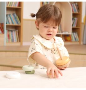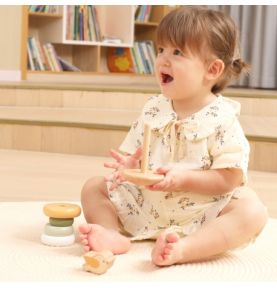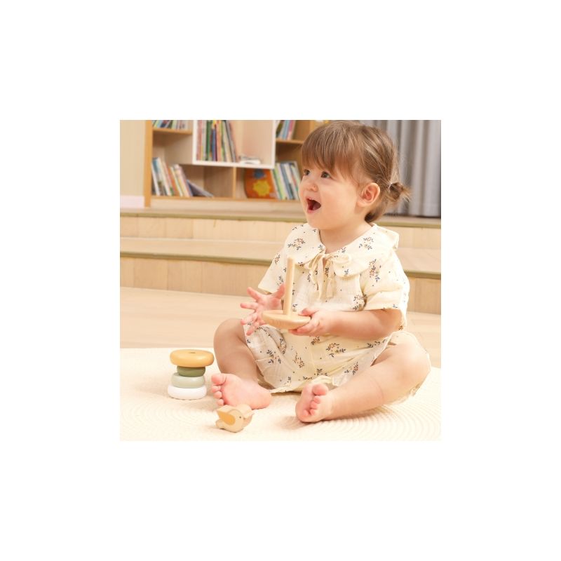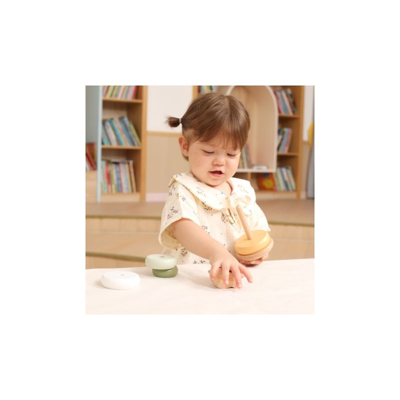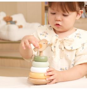 Drewniana piramidka edukacyjna rozwija motorykę, koordynację wzrokowo-ruchową oraz logiczne myślenie, ucząc dzieci zabawy kolorami i kształtami.