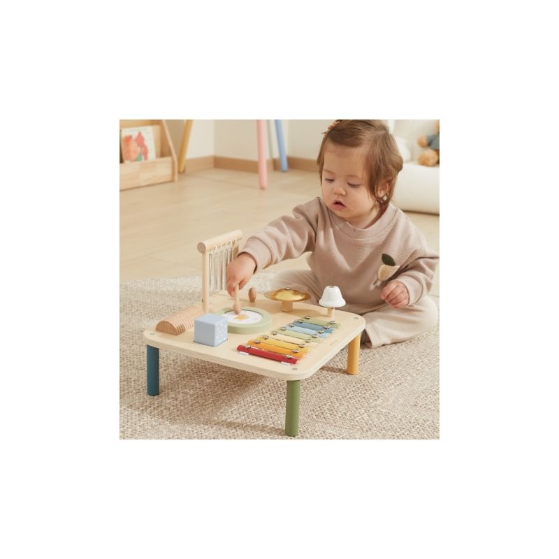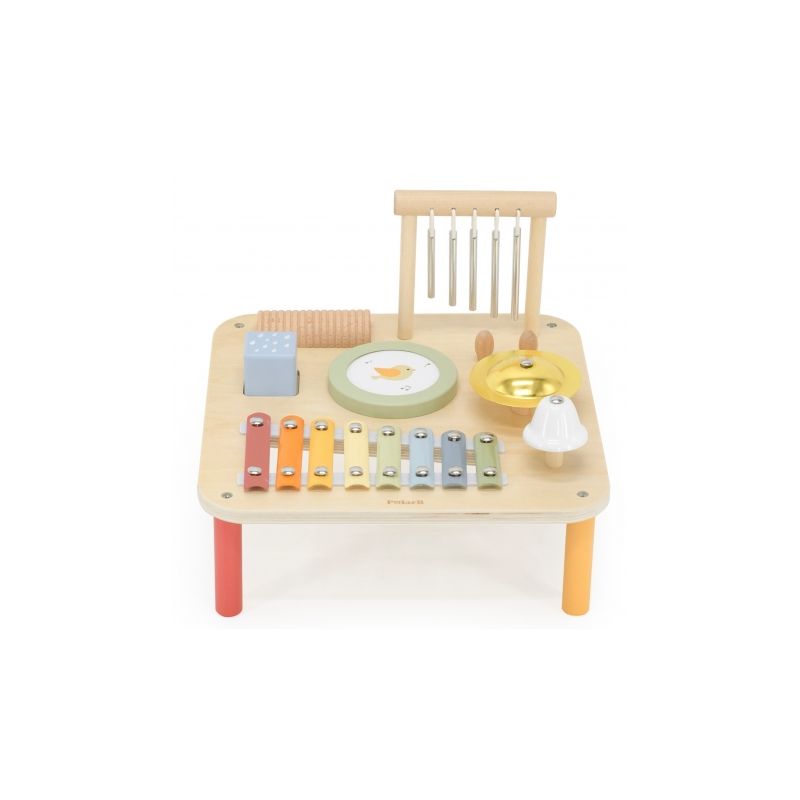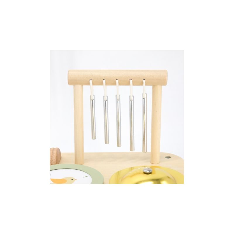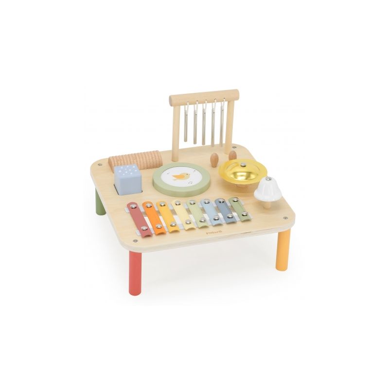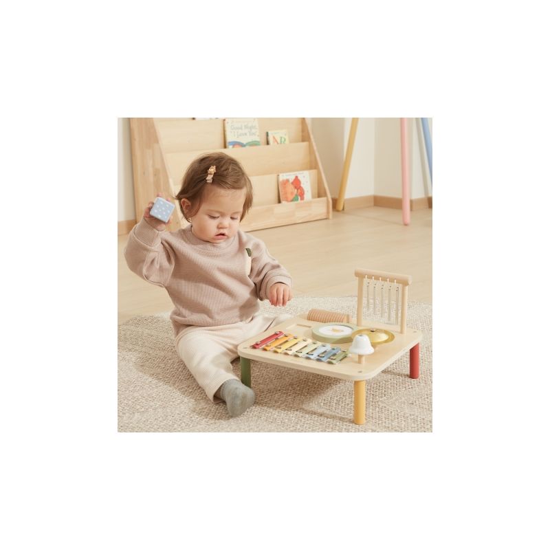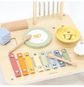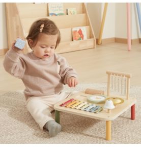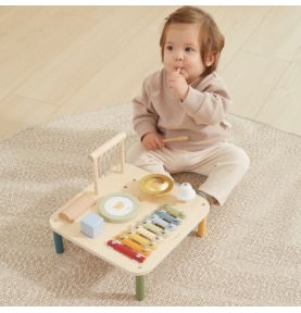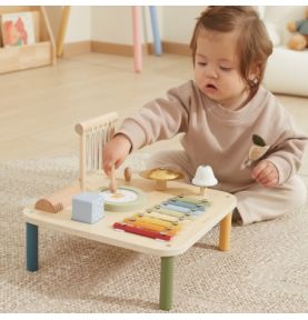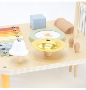 Interaktywny stolik muzyczny, który wprowadza dziecko w świat rytmu i melodii. Zawiera różnorodne instrumenty – cymbałki, bębenek, talerz, dzwonki, guiro, grzechotkę i pałeczki – rozwijając słuch muzyczny, koordynację i kreatywność. Wykonany z bezpiecznego, malowanego drewna w pastelowych barwach.
