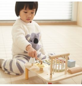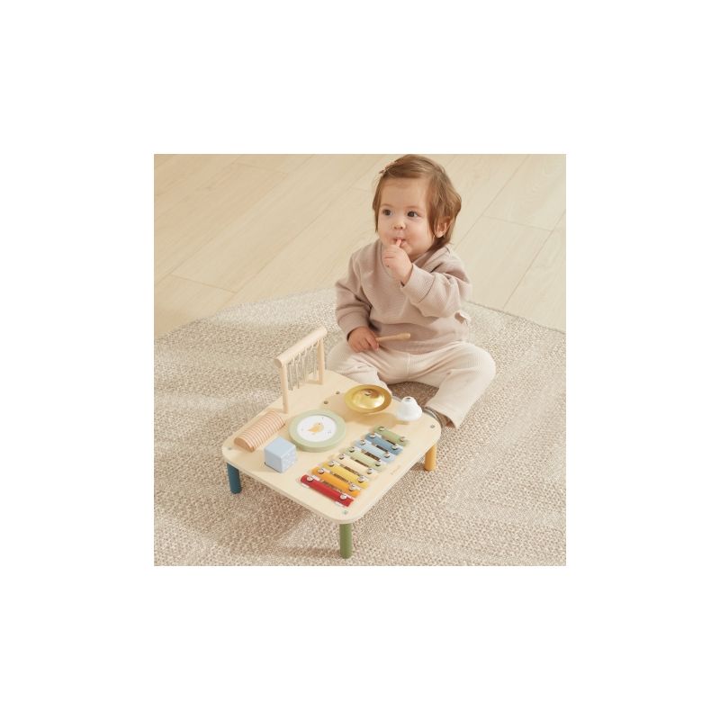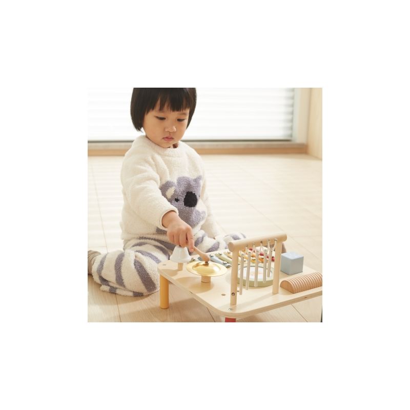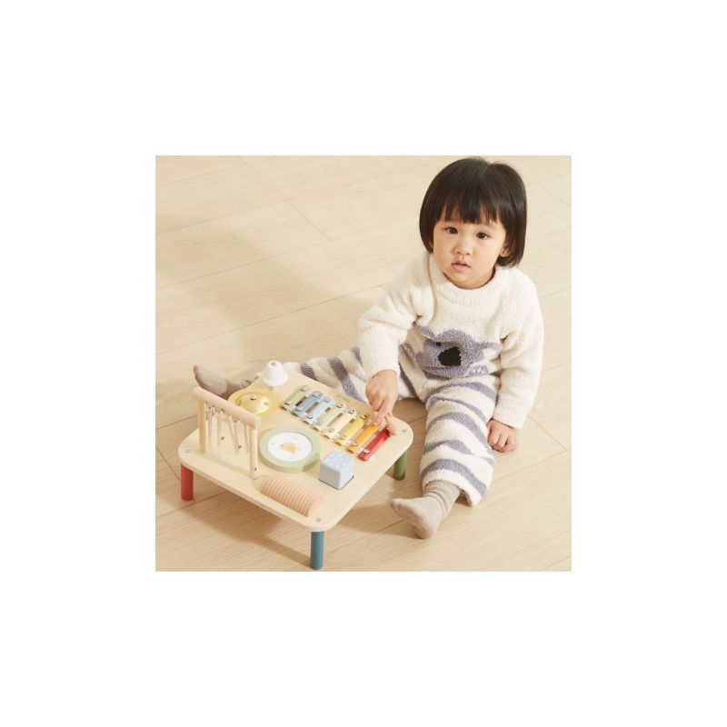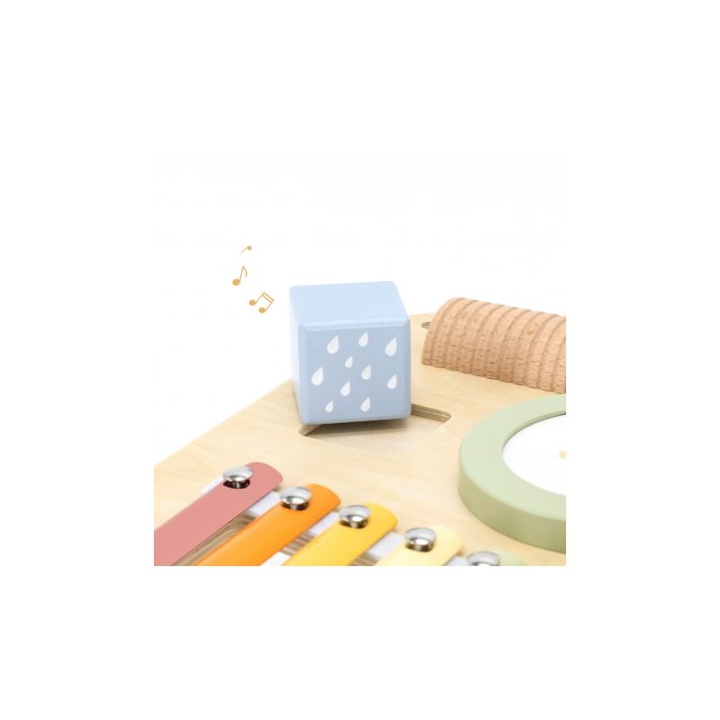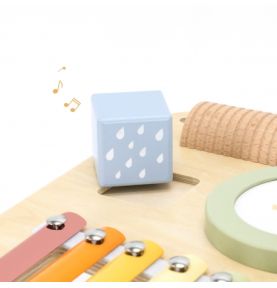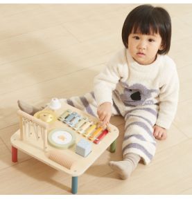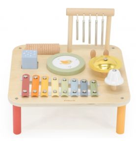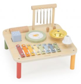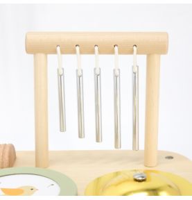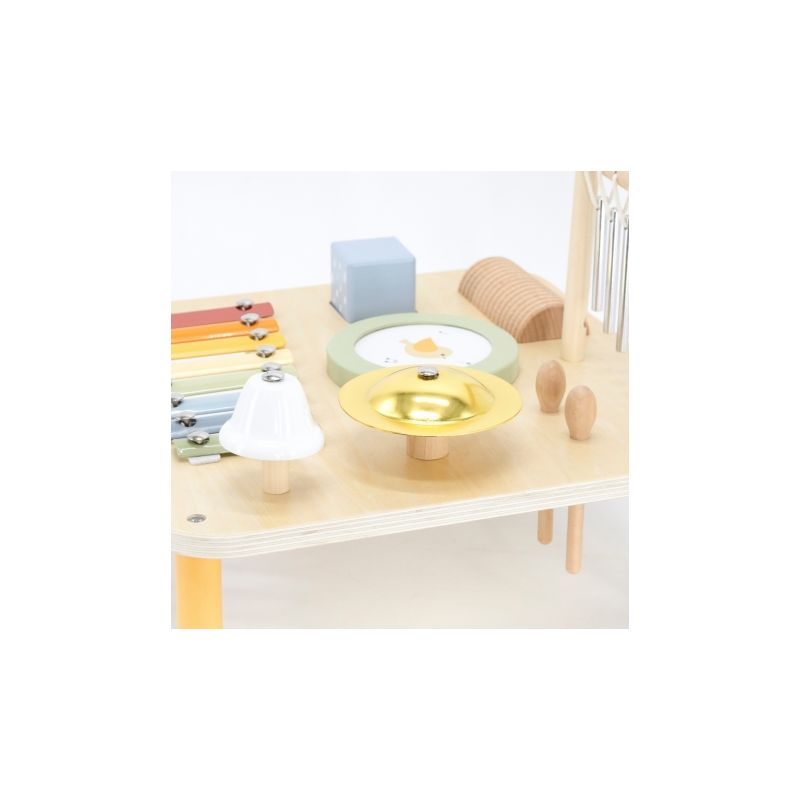 Interaktywny stolik muzyczny, który wprowadza dziecko w świat rytmu i melodii. Zawiera różnorodne instrumenty – cymbałki, bębenek, talerz, dzwonki, guiro, grzechotkę i pałeczki – rozwijając słuch muzyczny, koordynację i kreatywność. Wykonany z bezpiecznego, malowanego drewna w pastelowych barwach.