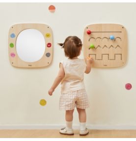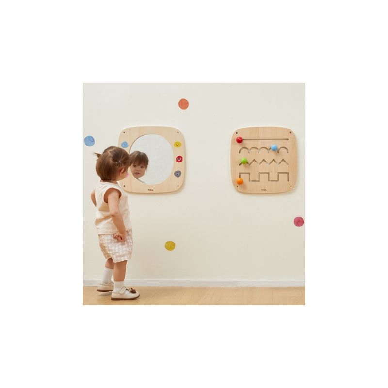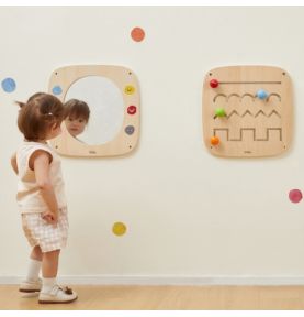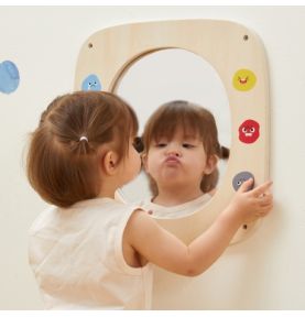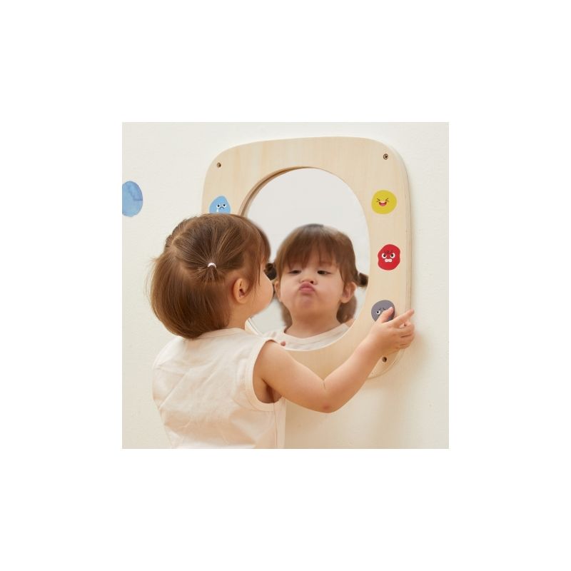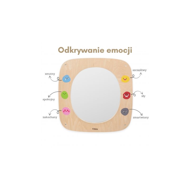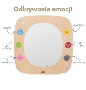 Drewniana tablica edukacyjna, która wprowadza dzieci w świat emocji. Centralne lusterko otoczone jest sześcioma kolorowymi twarzami przedstawiającymi różne emocje: radość, smutek, złość czy spokój. Dziecko może obserwować swoje odbicie i naśladować miny, rozwijając świadomość emocjonalną oraz koordynację mięśni twarzy.