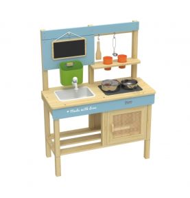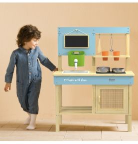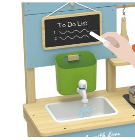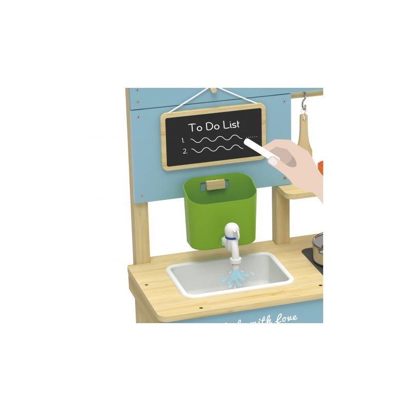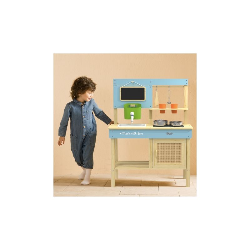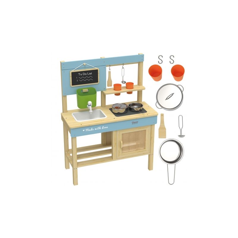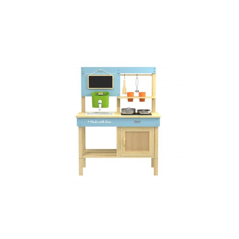 Naśladowanie dorosłych to dla dzieci fantastyczna zabawa! Drewniana kuchnia błotna marki Classic World to idealna propozycja dla małych miłośników gotowania na świeżym powietrzu. Wykonana z naturalnego, certyfikowanego drewna i ozdobiona pastelowymi akcentami, zachęca do kreatywnej zabawy w restaurację, sklep lub dom. Zbiornik z kranikiem umożliwia obieg wody, dzięki czemu dziecko może myć naczynia, nalewać wodę lub tworzyć pyszne błotne potrawy – ogranicza je jedynie wyobraźnia!
