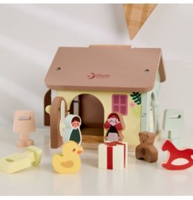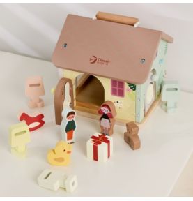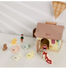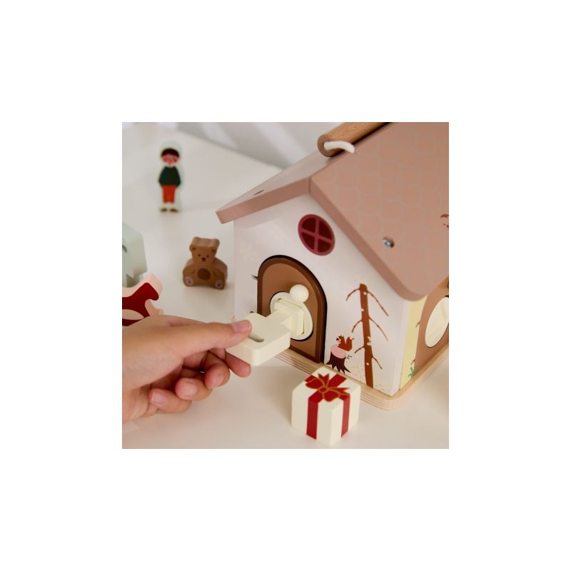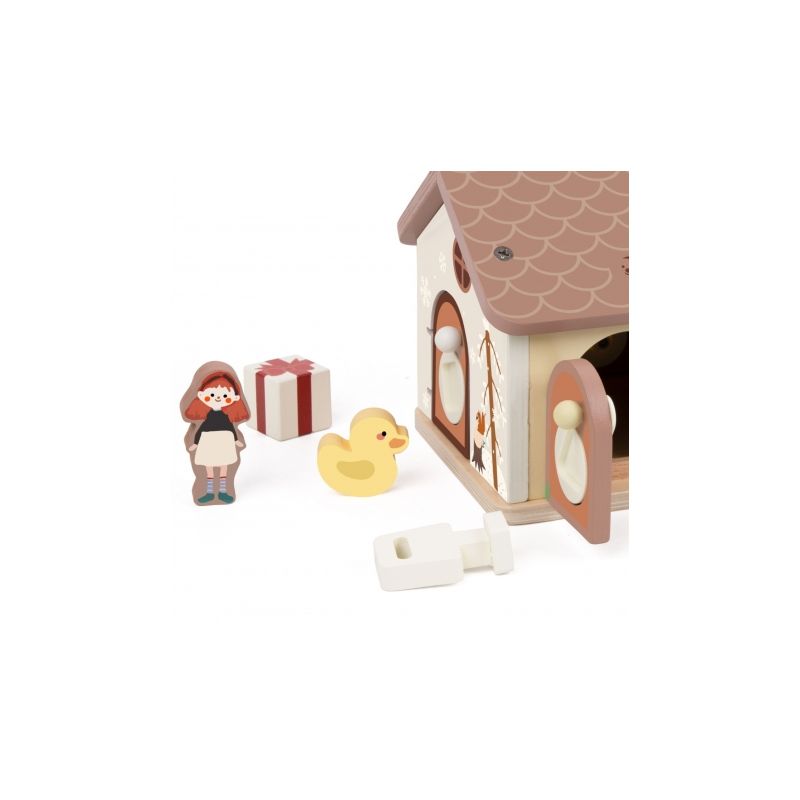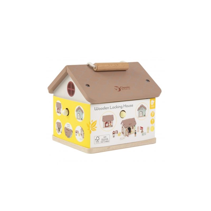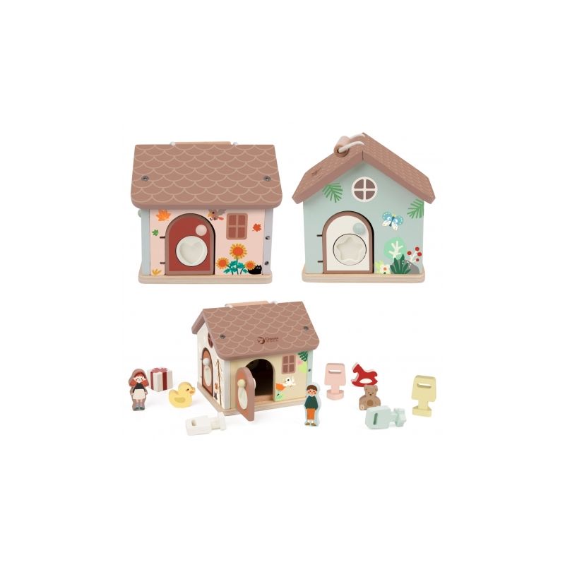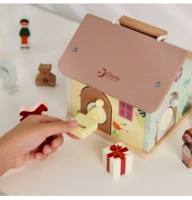 - Drewniany domek z uchwytem i 4 drzwiczkami z różnymi zamkami