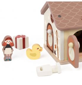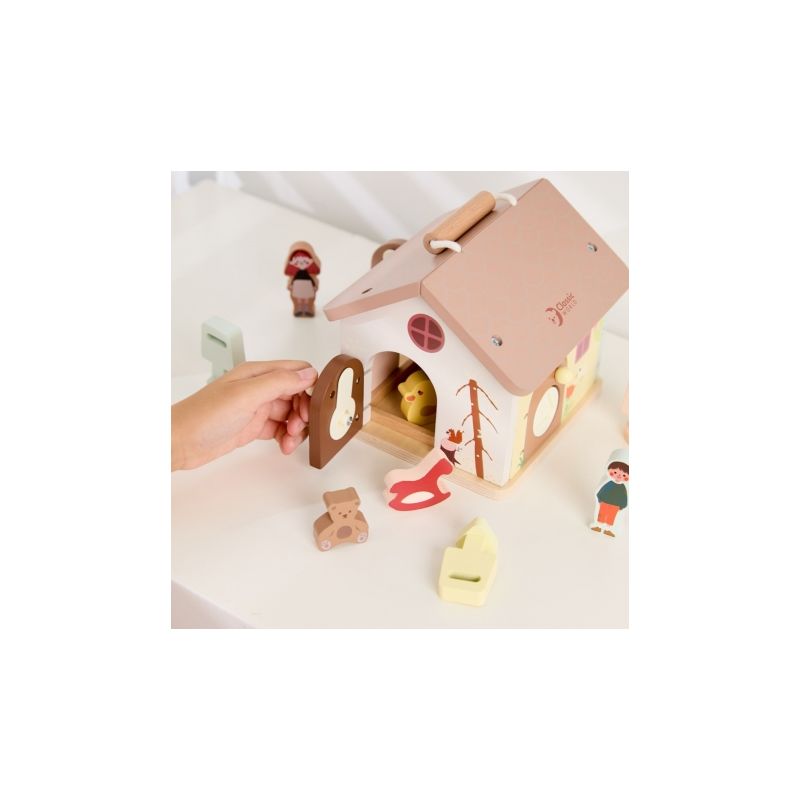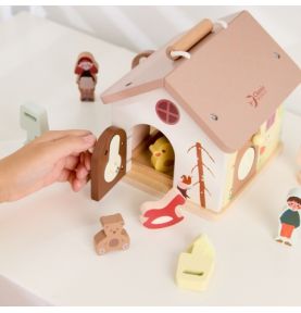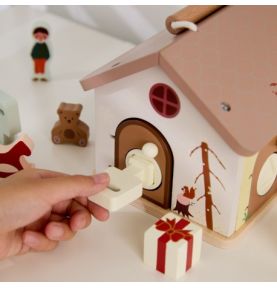 Drewniany domek edukacyjny z 4 drzwiczkami i mechanizmami blokującymi. Dziecko dopasowuje kluczyk do odpowiednich drzwiczek, odkrywając w środku kolorowe klocki z ilustracjami, takimi jak mały miś czy prezent. Zabawka wspiera rozwój małej motoryki, zręczności i logicznego myślenia, a wykonanie z trwałego, bezpiecznego drewna sprawia, że jest odpowiednia dla dzieci już od 18 miesiąca życia.