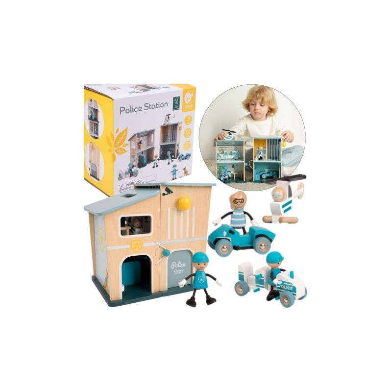 Drewniany zestaw Posterunek Policji 12 el. od Classic World dla dzieci od 3 lat. Wspiera rozwój wyobraźni, małej motoryki i kreatywne zabawy w odgrywanie ról.