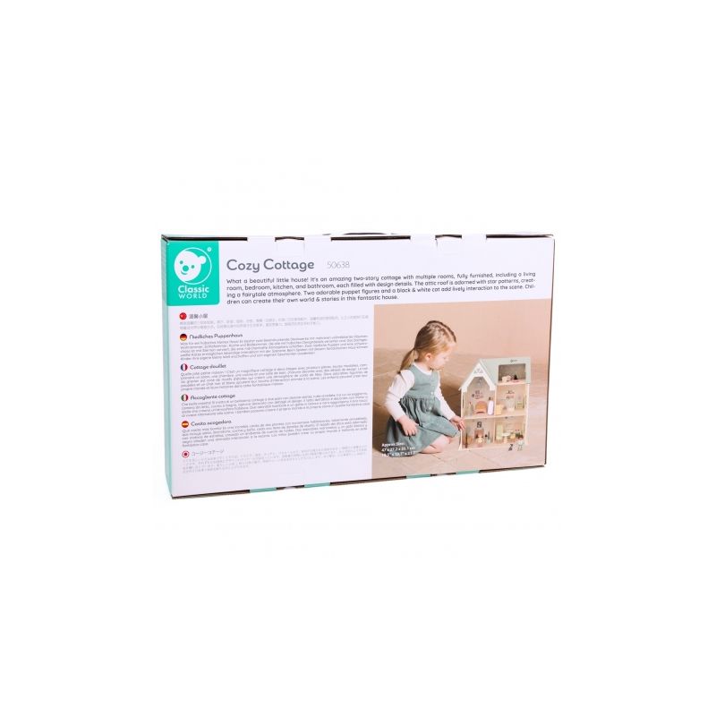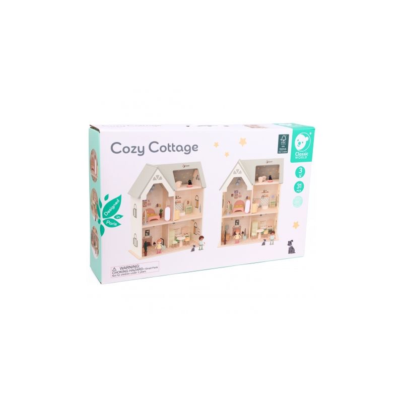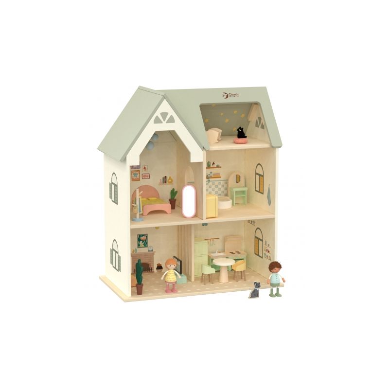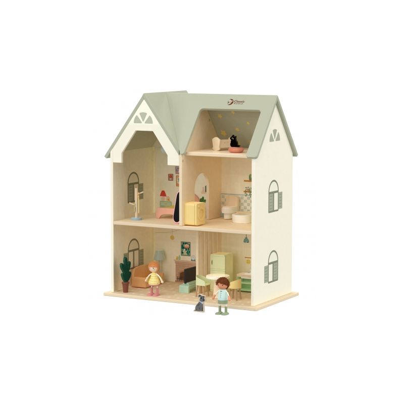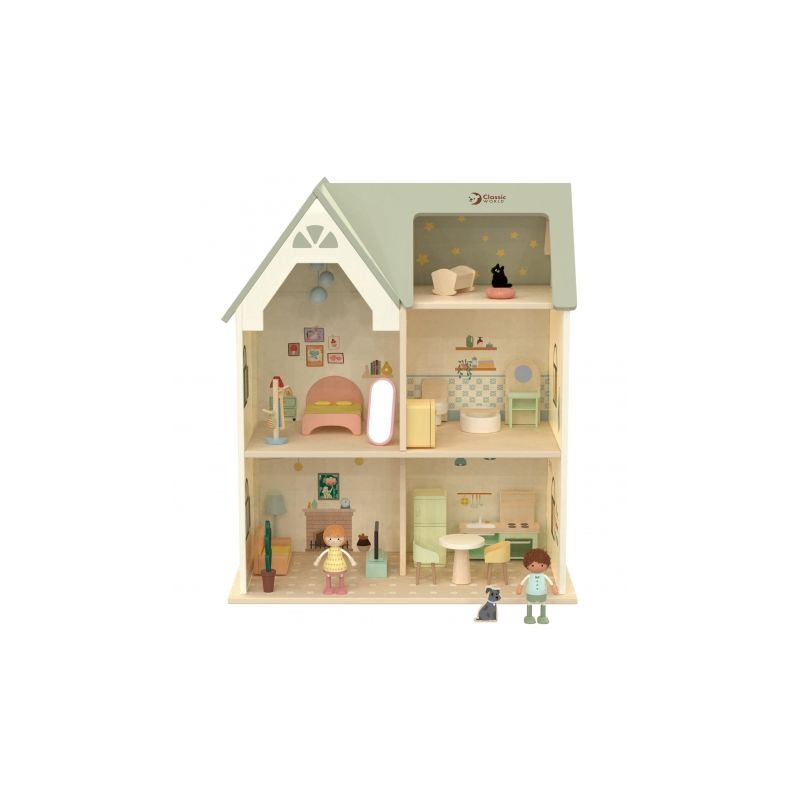 Dwupiętrowy domek z poddaszem i mebelkami od Classic World dla dzieci od 3 lat. Wspiera kreatywność, zdolności manualne i wyobraźnię podczas zabawy w odgrywanie ról.