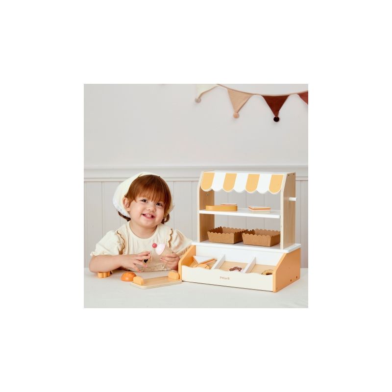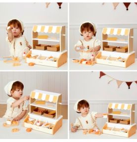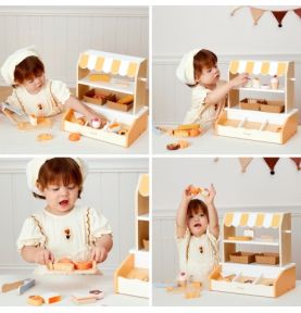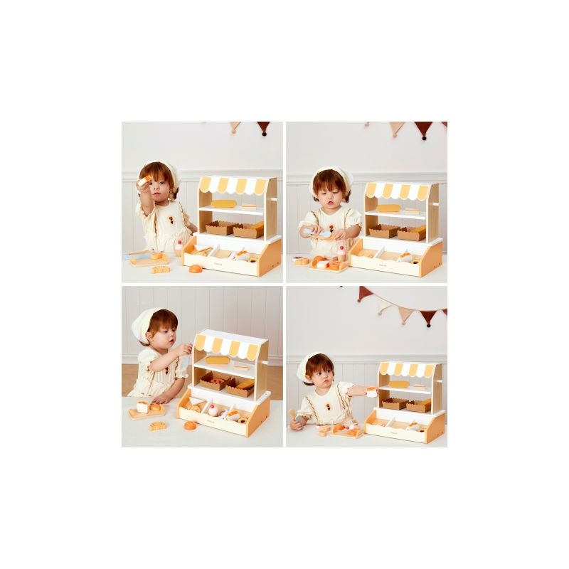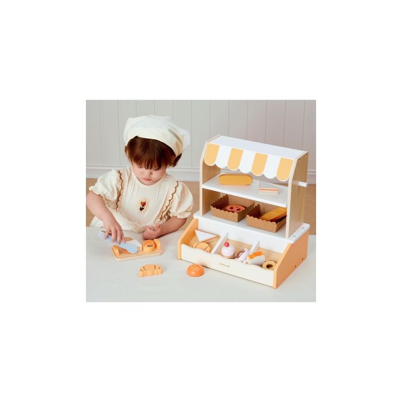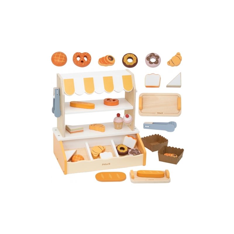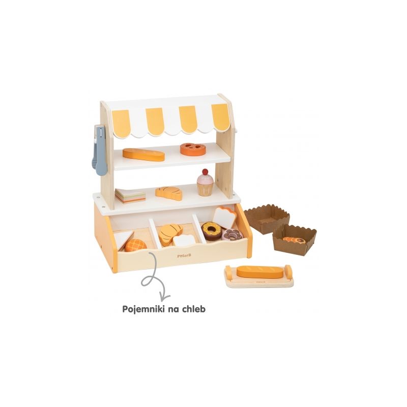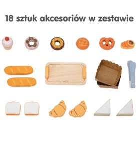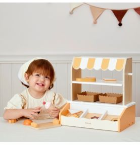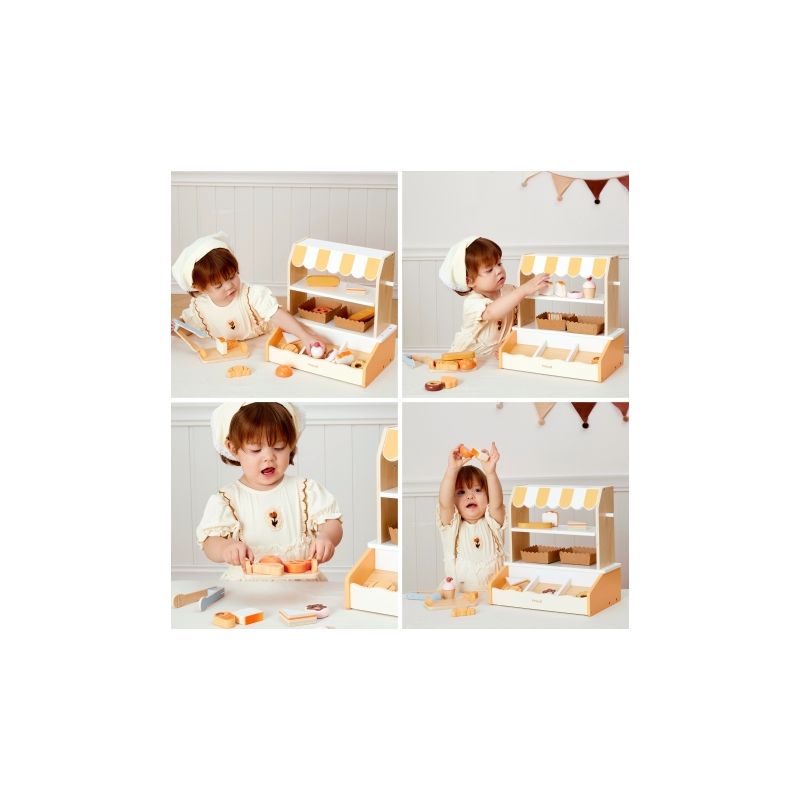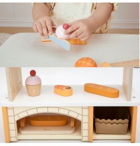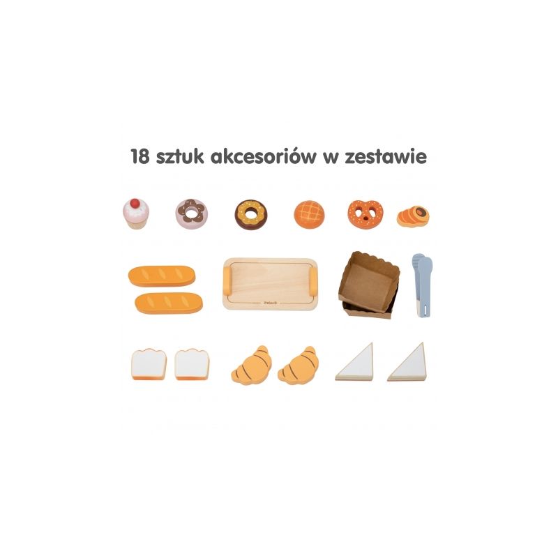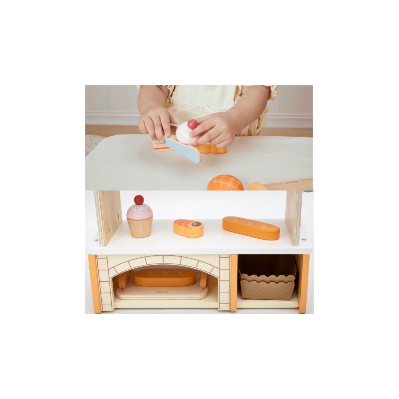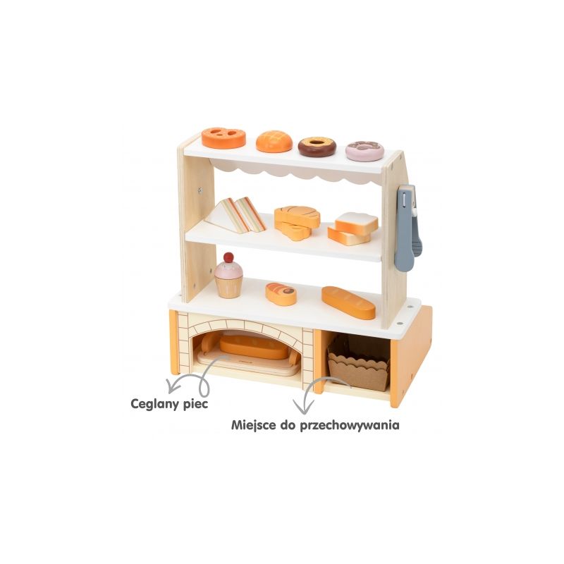 Stojak wyposażono w dwie półki ekspozycyjne, imitację pieca na chleb oraz praktyczne szczypce, co nadaje zabawie autentyczności. Pastelowe barwy – biel, naturalne drewno i odcienie pomarańczu – sprawiają, że piekarnia pięknie prezentuje się w każdym pokoju. Zestaw wspiera rozwój społeczny, kreatywność oraz zdolności motoryczne dziecka.